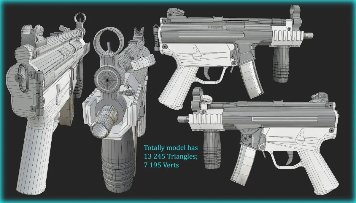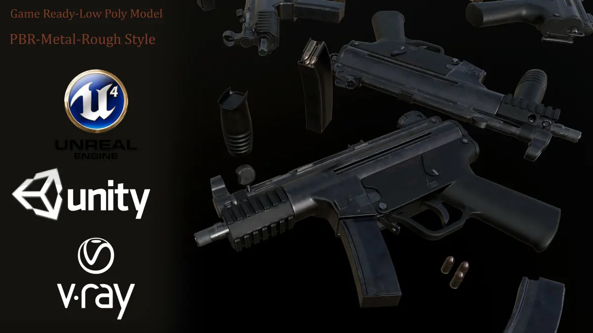 Also contain maya binary file with model separated by parts: -Body, -Barrel, -Mag, -Foregrip, -Bolt, -Trigger, -Bullet, -Cartridge, -Switchers.