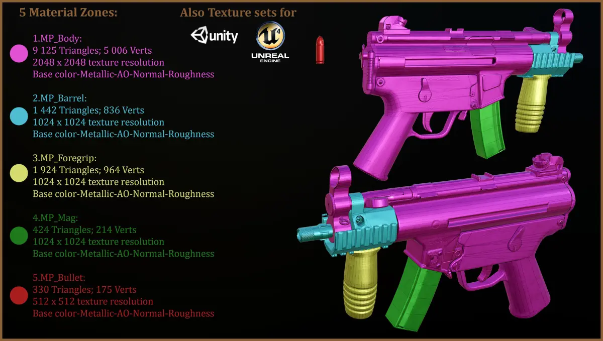 5.MP_Bullet:330 Triangles; 175 Verts |512 x 512 texture resolution |Base color-Metallic-AO-Normal-Roughness | + Texture sets for UE4, Unity, Vray |