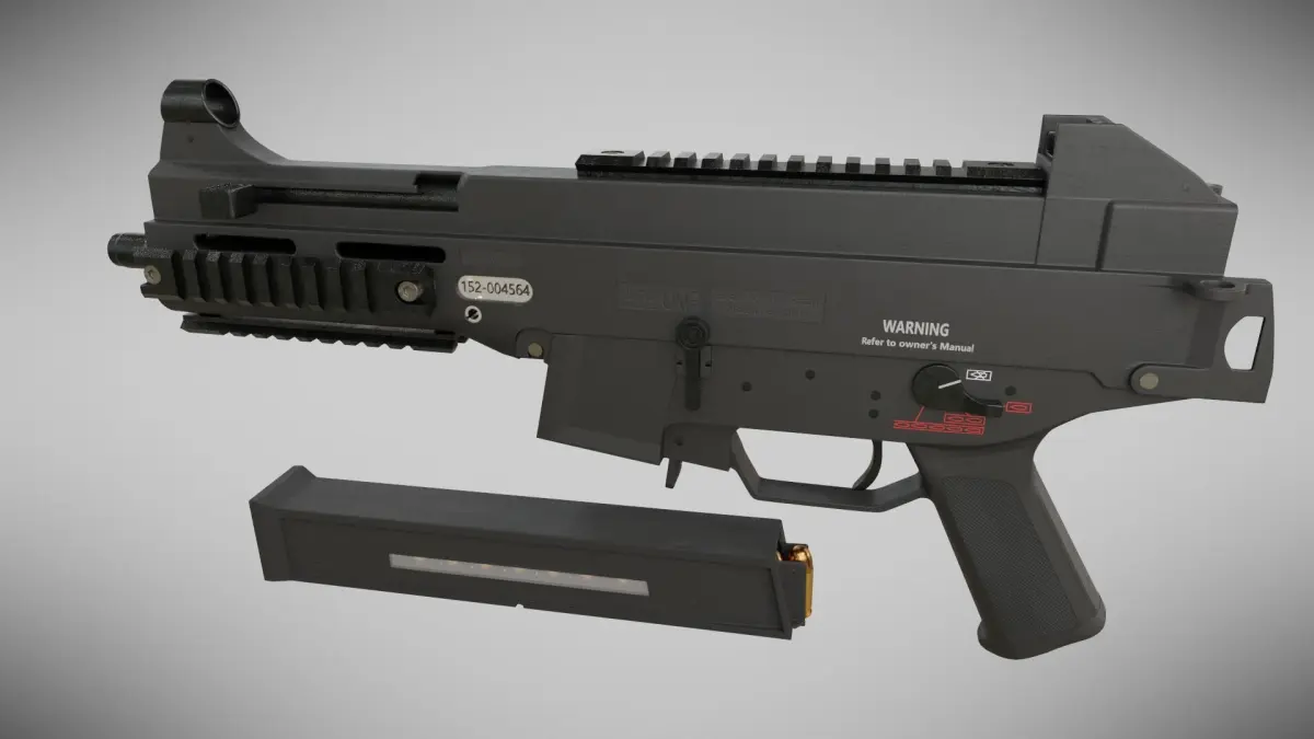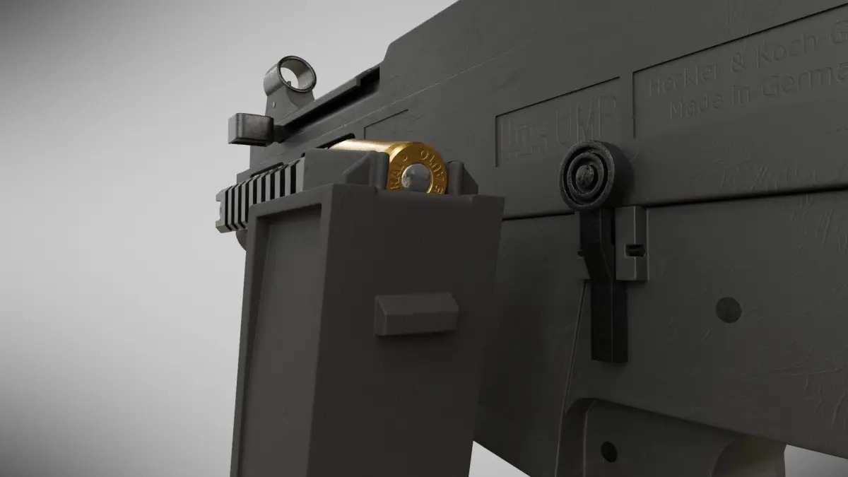 Authentic, hi-poly, to scale, UMP45 by Heckler & Koch. This version is made in Germany. Useful for photo realistic settings. In the blender version, you can turn off subsurface modifiers to get a low poly version. All materials are PBR. Fully compatible with Eeevee renderer as well as Cycles. Includes .45 caliber ammo from Federal. This model is extremely detailed. It even has rifling on the barrel as it is intended for photorealism.