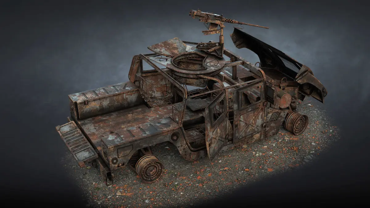 The game low-poly 3d-model of burnt US military vehicle HMMWV M998 Humvee.