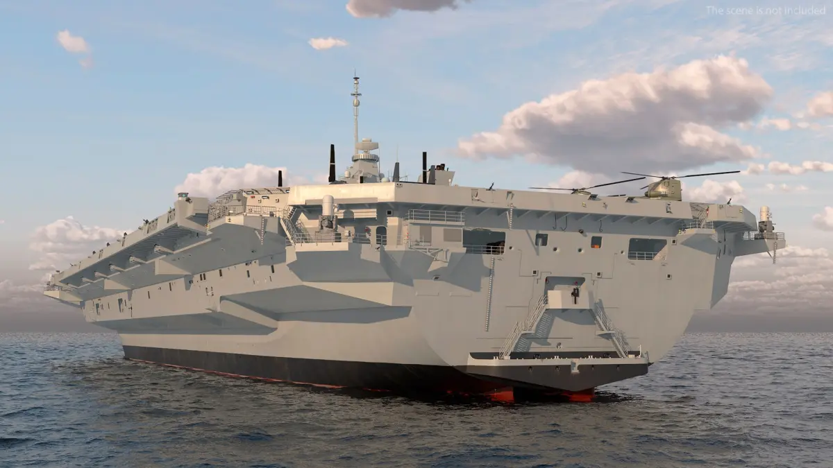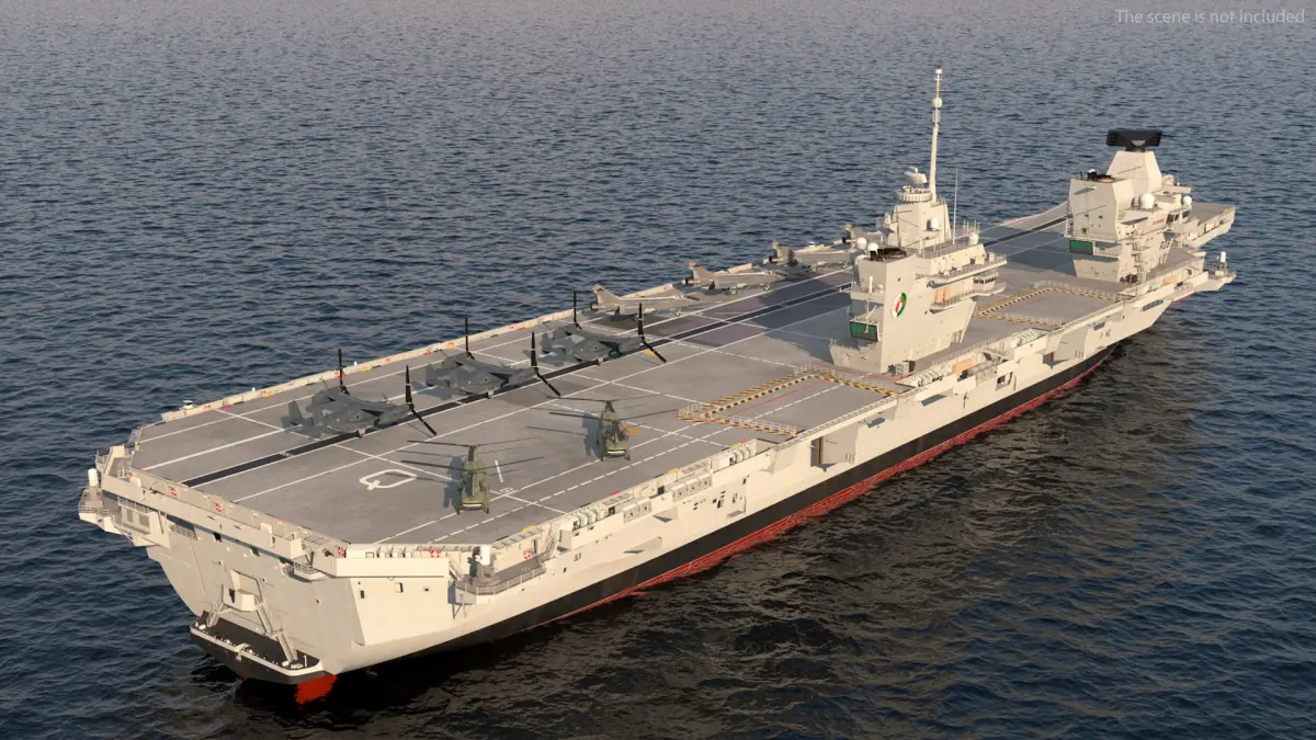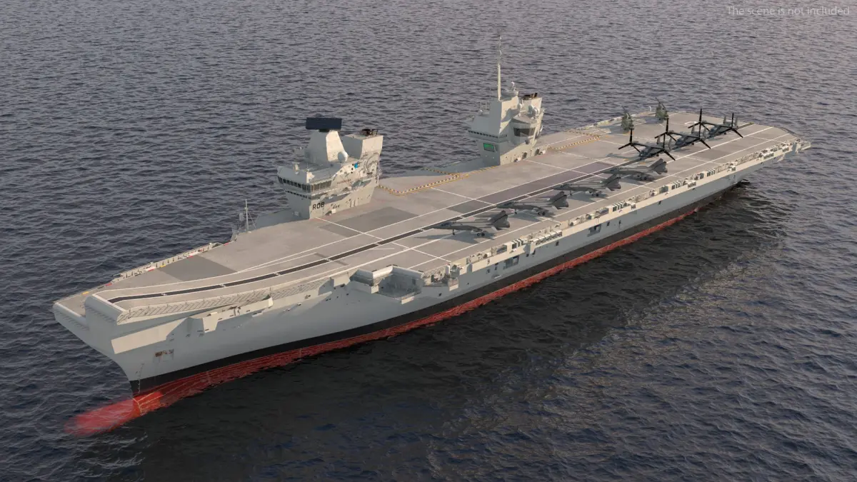 HMS Queen Elizabeth with Military Equipment is a 3d model of the modern British Royal Navy aircraft carrier, equipped with various military assets and detailed weaponry, representing the operational configuration of this advanced warship.