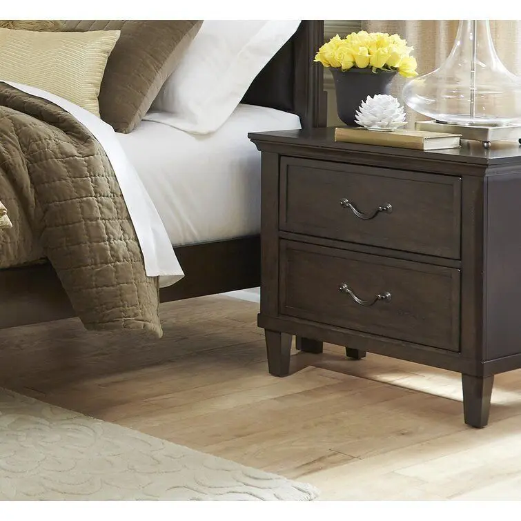 - This nightstand features under-top moldings, framed drawers, and tapered legs. Drawers are dovetailed and metal guides. Hardware is a decorative ribbon swing handle finished in Bronze. Hazelnut finish with few groupings of wormhole distressing.