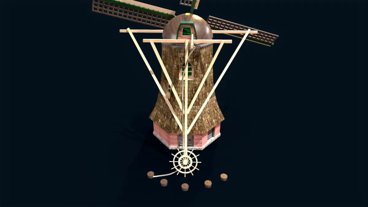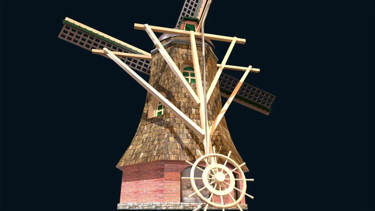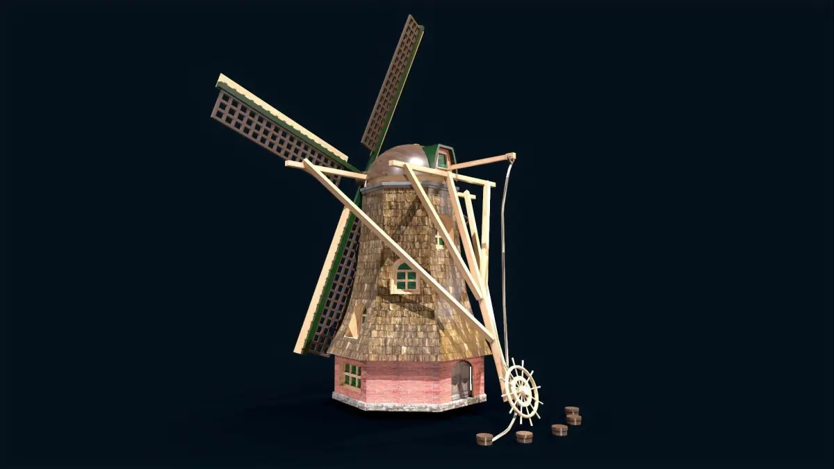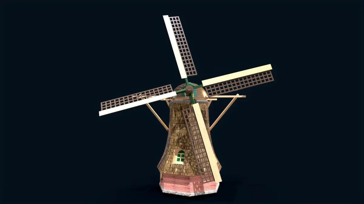 The holland wind turbine is a machine that uses sails that are mounted on a revolving shaft to harness the wind's energy. The sails are mounted at an angle or given a minor twist so that the wind's force is split into two parts, one of which imparts rotation in the plane of the sails.This model can be applied to animated films, short films, virtual environments, augmented environments, 3-D games, and more.