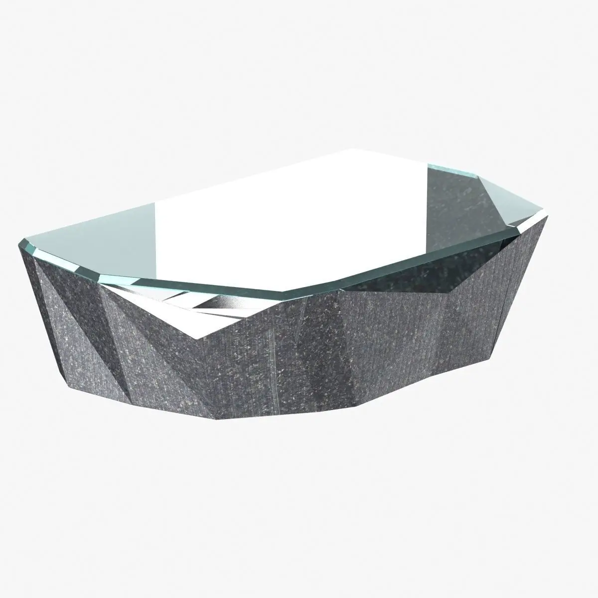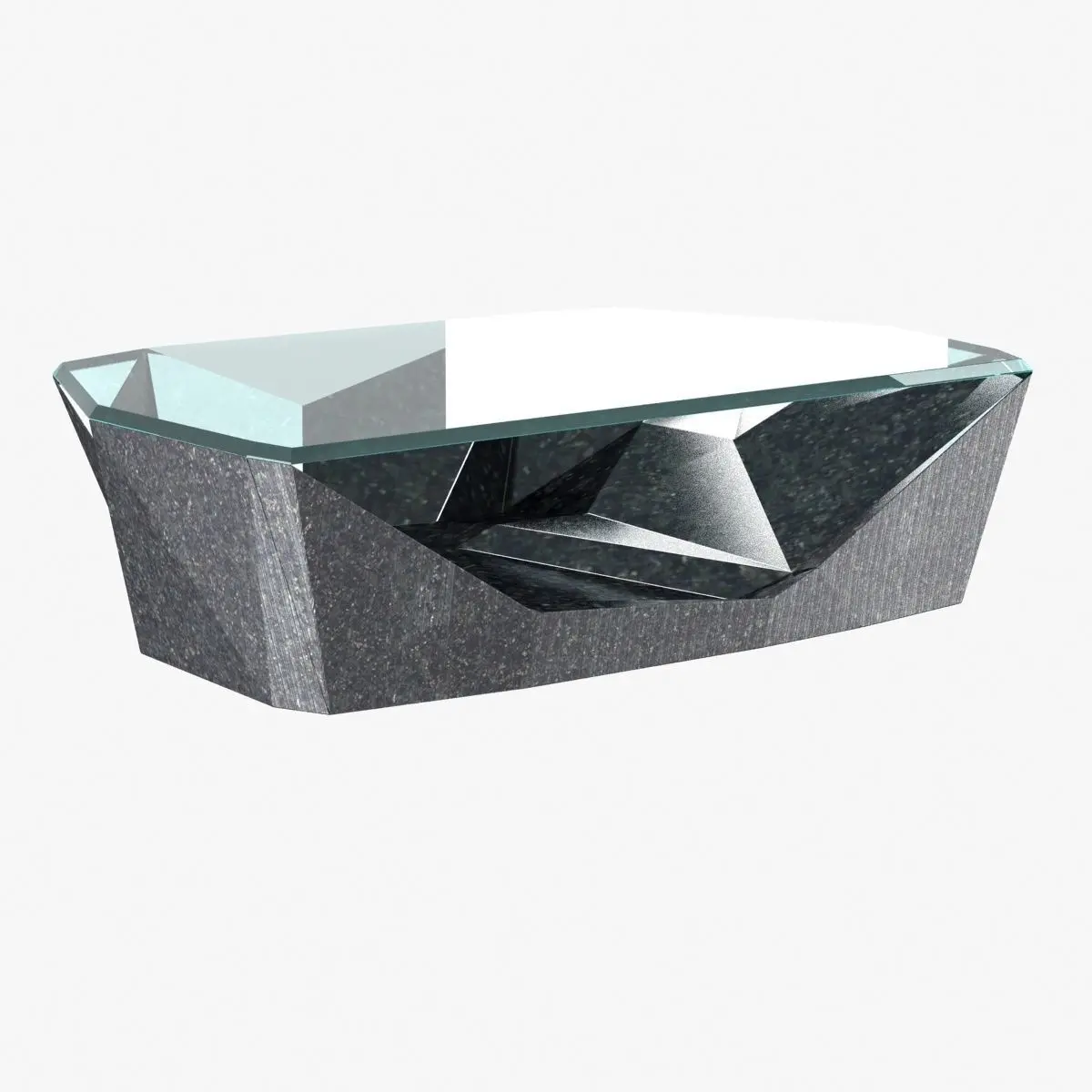 The Seismic Cocktail Table illustrates a rousing convergence of tactility and algorithm. Fashioned by British designer Alexander Purcell Rodrigues, the dramatically faceted antique brown stone features a rough exterior and smooth interior with a precision-cut Starfire glass top.