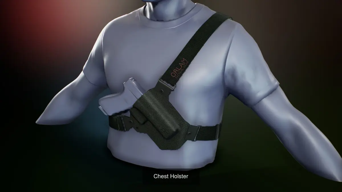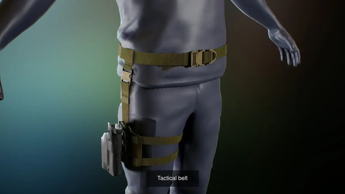Tactical police gear pack. Includes tactical belt with leg pad-left and right handed variants, 2 fabric holsters, Chest holster and 2 plastic holsters