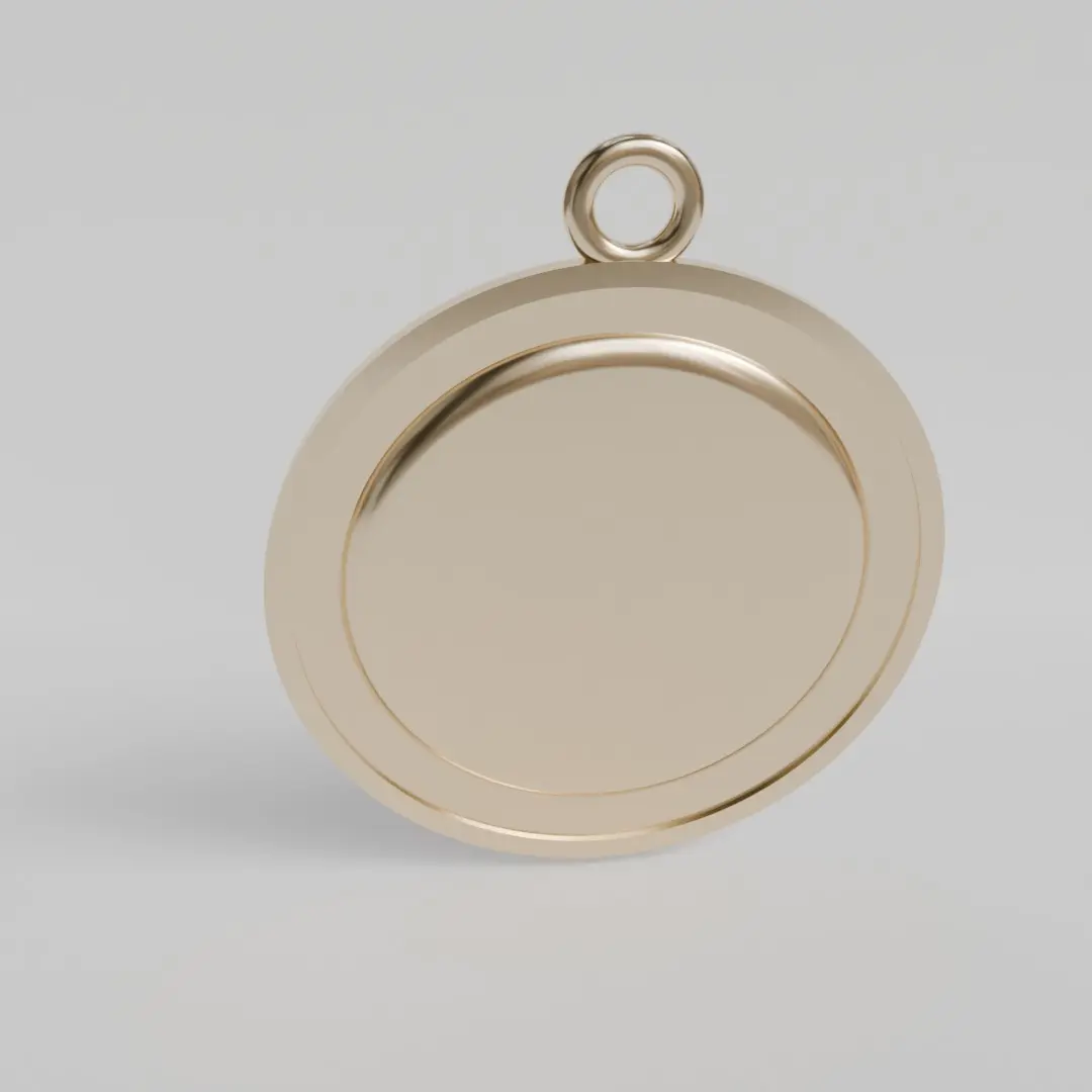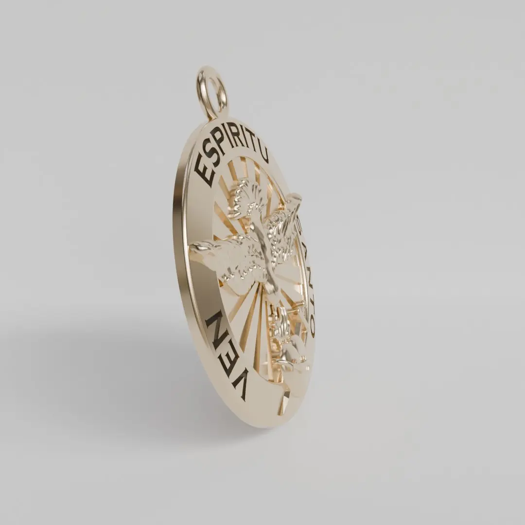 18k gold pendant medal.Graphic representation of the Holy Spirit engraved in relief, with texts written in depth on the edge of the bezel with a diameter of 14 mm.