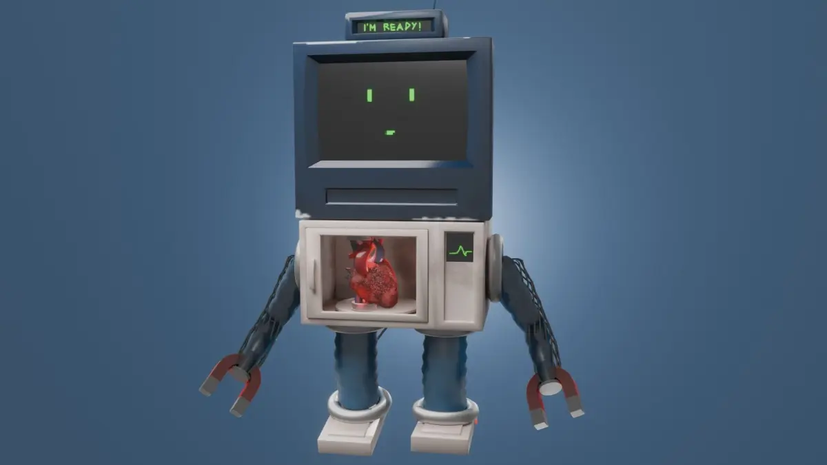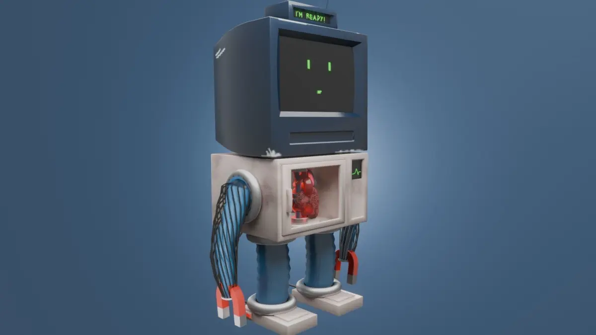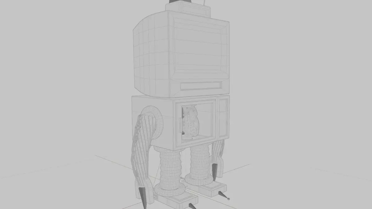 A sci-fi robot character made with home appliances (an old tv, a microwave and plugs).