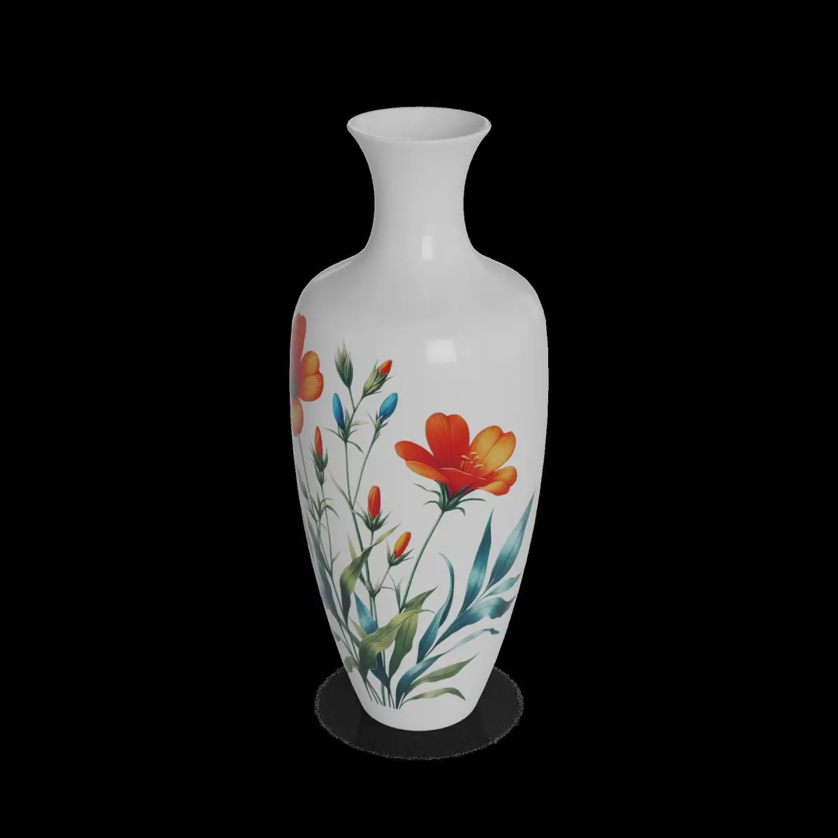 Ceramic Vase: A stunning ceramic vase with a glossy finish, perfect for adding a touch of elegance to any room. The vase features a sleek design with a narrow neck and a wide base, allowing it to hold a generous amount of flowers or decorative branches. The packaging is a sturdy cardboard box with a vibrant floral pattern, showcasing the beauty of the vase inside. The box includes an informational label with the product name, size, and care instructions.