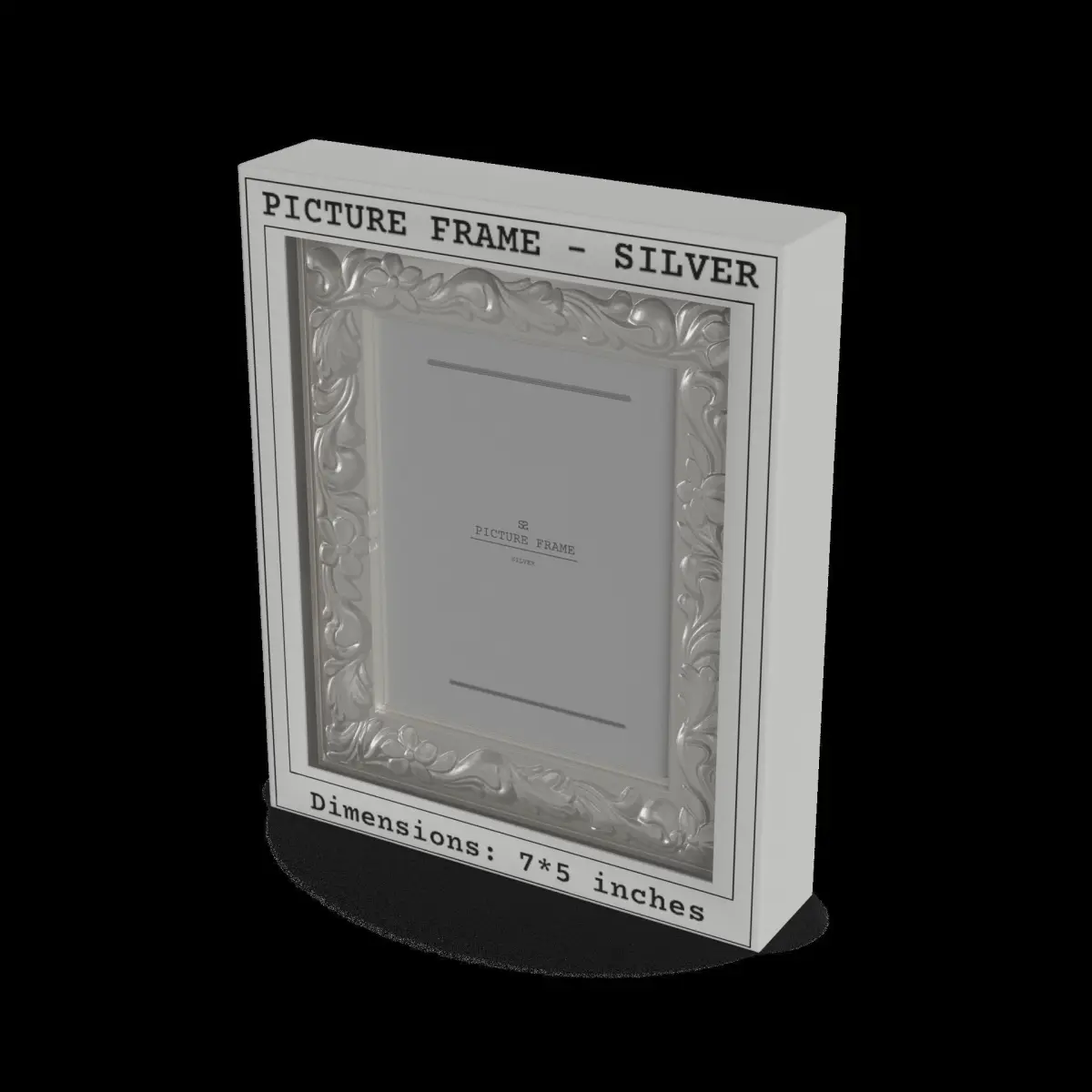 Picture Frame: A classic picture frame made of silver metal. The packaging consists of a cardboard box with a label displaying the product's name and the frame's dimensions. The frame can hold a 5x7 inch photo and is a timeless way to display cherished memories.