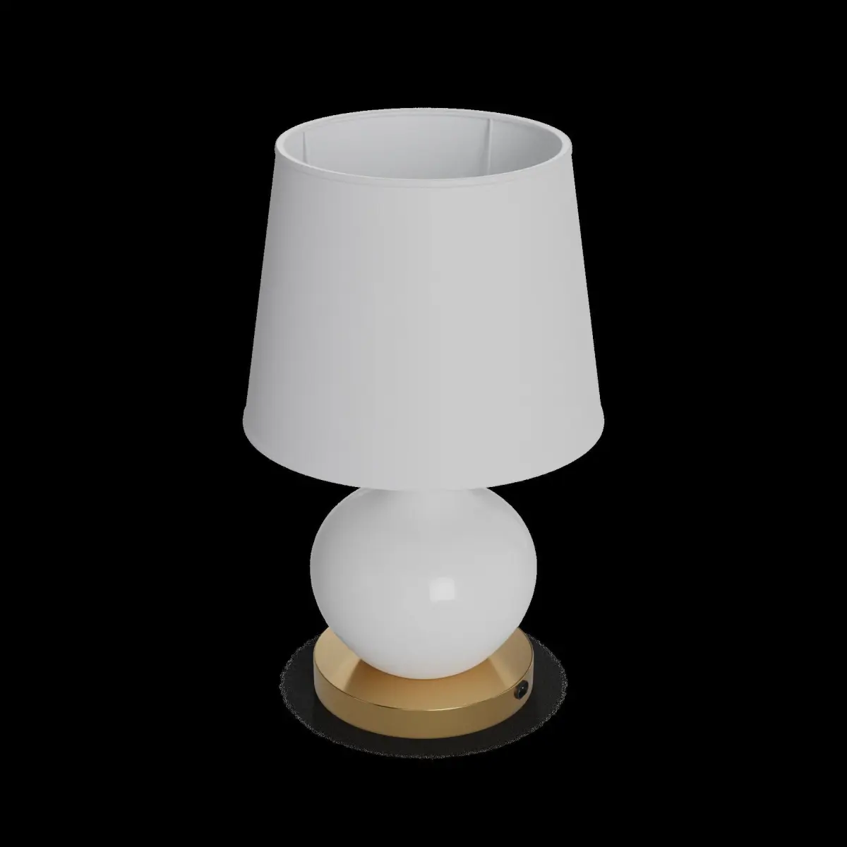 Table Lamp: A contemporary table lamp with a ceramic base in a glossy white color. The packaging is a cardboard box with a clear plastic window, allowing you to see the lamp's sleek and modern design. The label on the packaging includes the product name, size (18 inches tall), and a lightbulb icon to symbolize its function.
