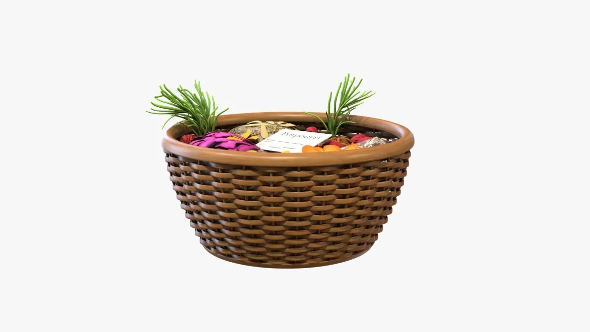 Potpourri: A charming woven basket filled with a mixture of dried flowers, herbs, and spices. The basket has a rustic and natural look, perfect for adding a touch of warmth to any room. The label attached to the basket provides information about the ingredients used and suggests placing the potpourri in a decorative dish to release its delightful fragrance.