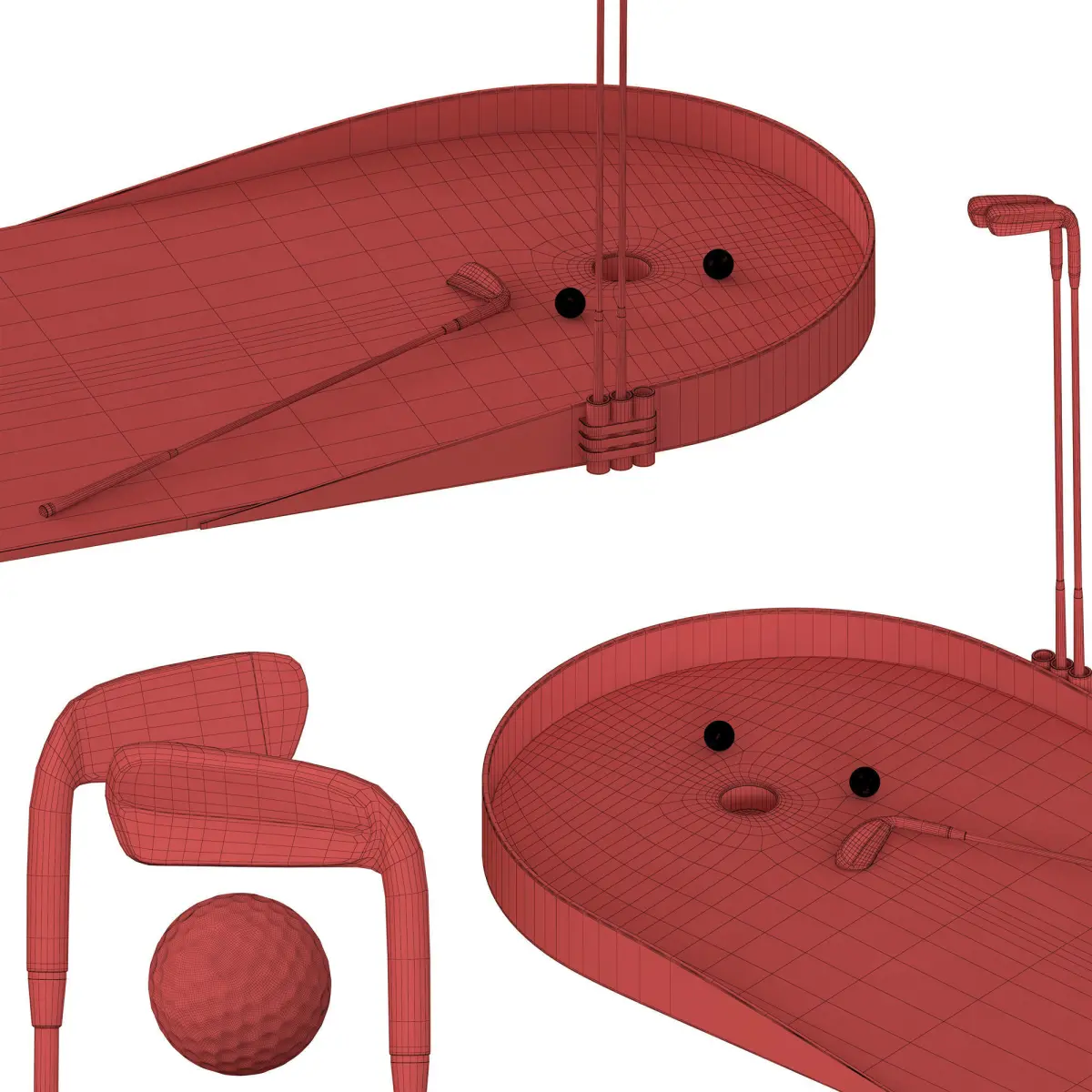 The golf kit includes a pad made of carpet with special markings, a pedestal with a metal golf hole with plastic flanges, a golf club, a golf ball in two colors (white and bright yellow)
