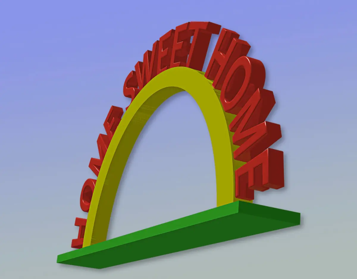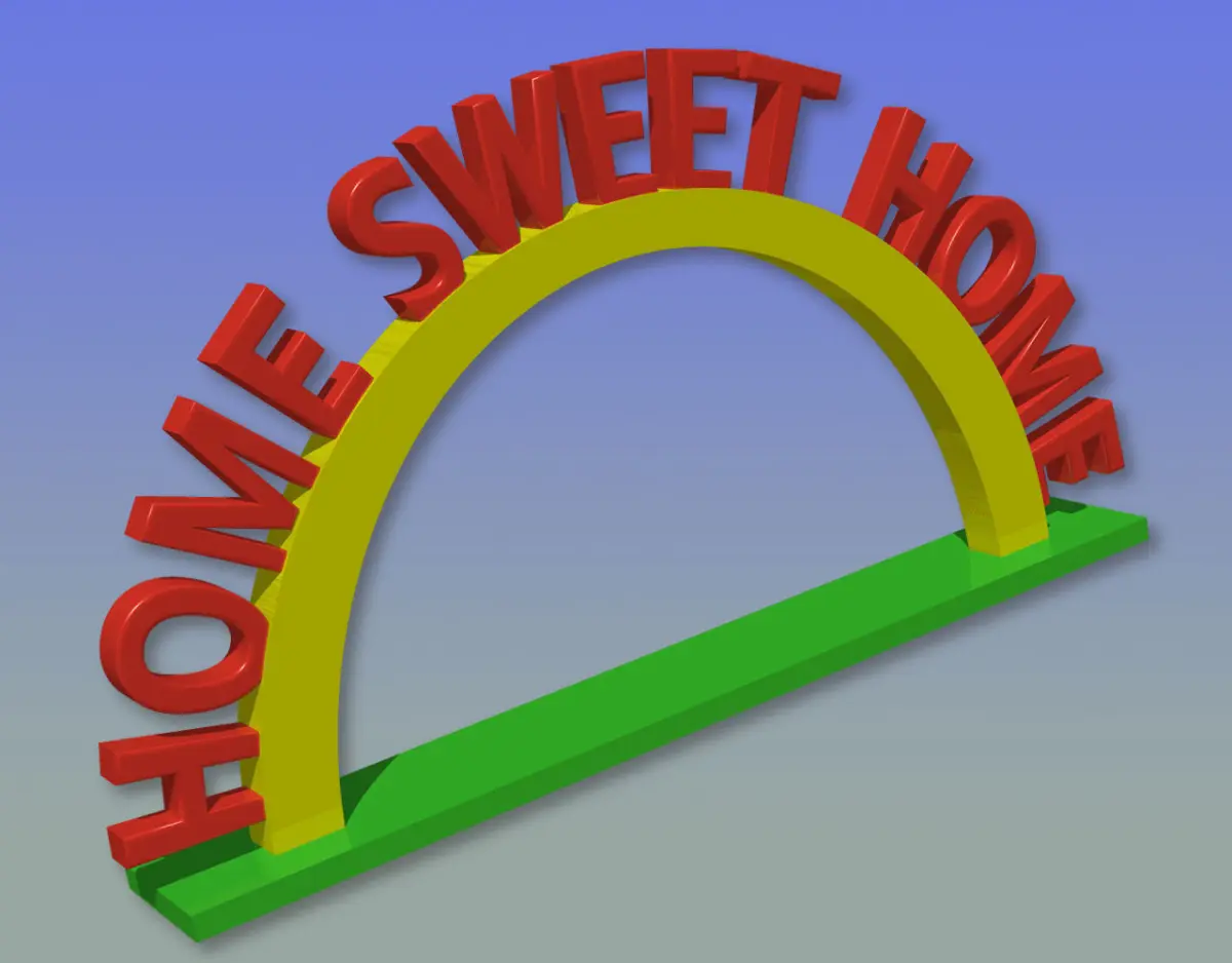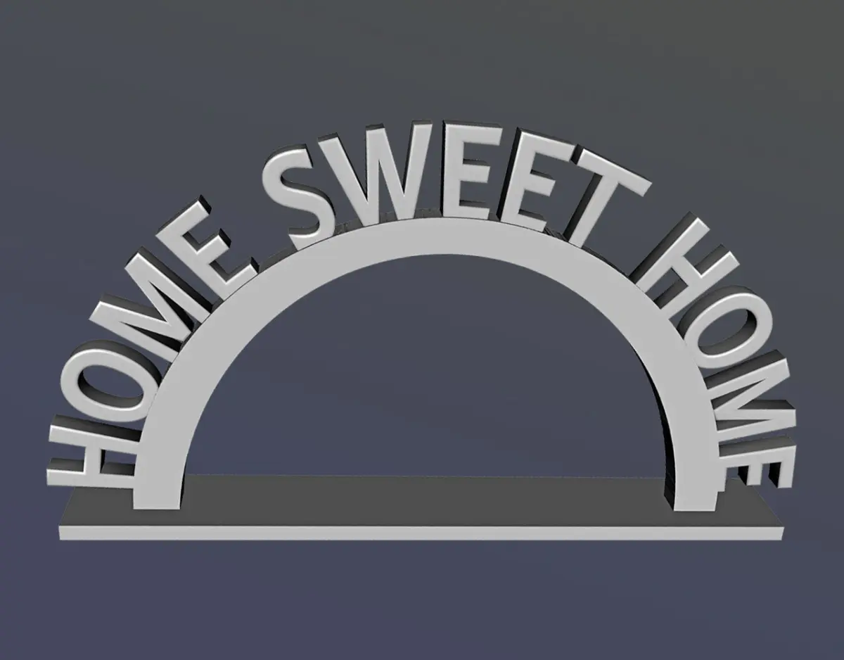HOME SWEET HOME display object for counter top, shelf top, desk top, etc.STL and OBJ formats. OBJ format divided into text, arch, and base elements to maximize versatility.
