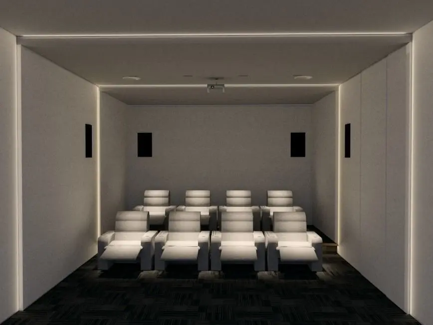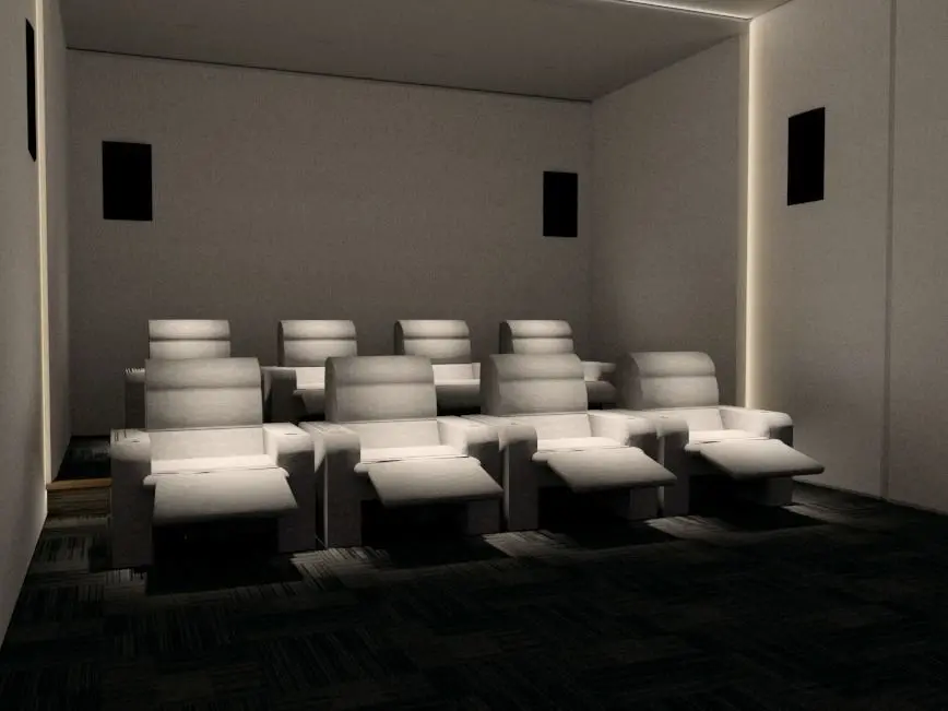 An elegant home theatre design. This file contains two designs of home theatre i.e. 2 models in the same file with 2 design options. I have also provided its 2D floor plan with measurements. The 3D model is rendered ready. 2 Views of each design are provided. This home theatre has a 6.2.1 audio system, with ambient speakers and surround speakers with one subwoofer. All the materials used are high resolution.