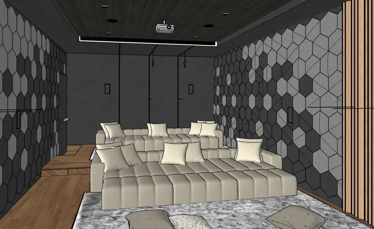 An contemporary cinema room design. It can be used in luxury villa designs, in custom made areas. The cinema room is specially designed for the indoor theatre experience.