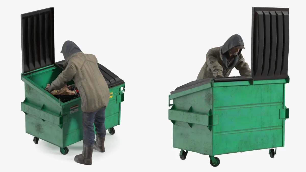 Homeless Man Digs Through Dumpster is a 3d model of an individual experiencing homelessness, actively searching through a dumpster, capturing a poignant and realistic depiction of this social issue.