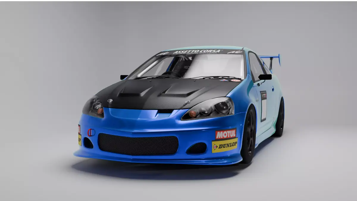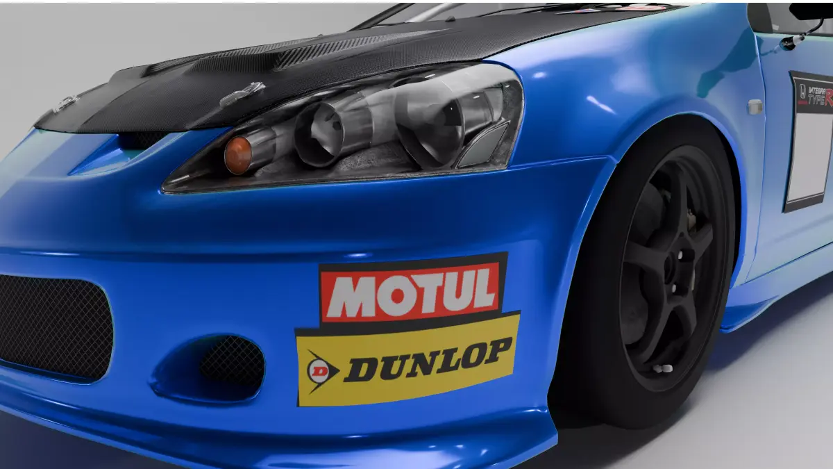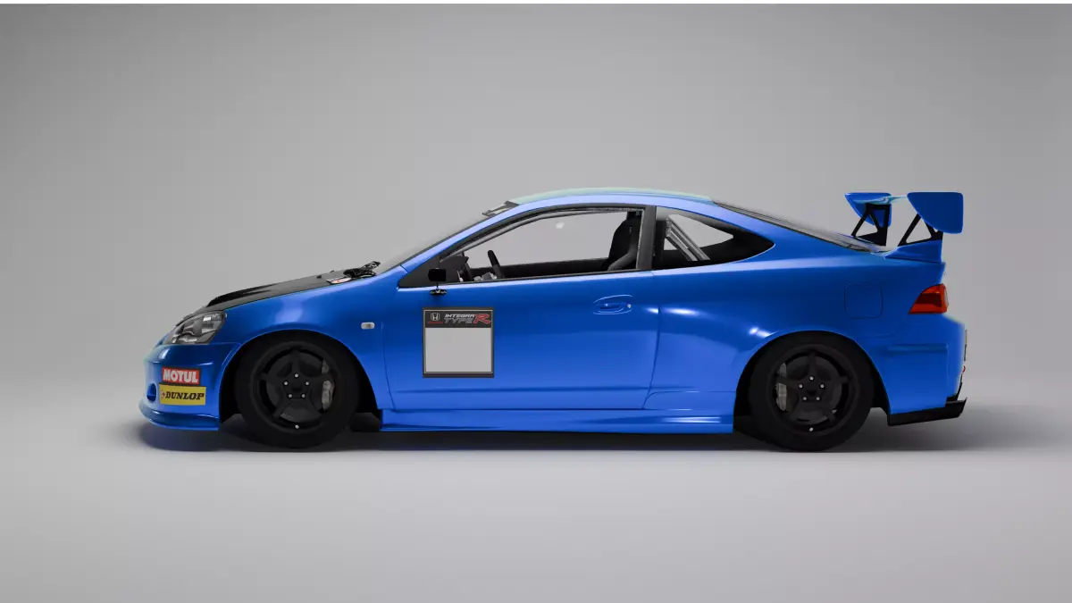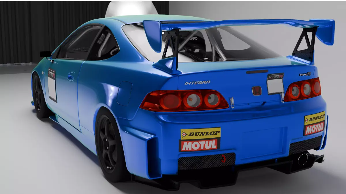 - This 3D model depicts a Honda Integra Type R (DC5) Race-Spec 2004, modified for competitive track use. The car features an aggressive aerodynamic package, including a large GT-style rear wing, race front bumper, and extended side skirts. The exterior is finished in a vibrant blue with a contrasting carbon-fiber hood. Racing decals from Motul and Dunlop add authenticity, while the interior showcases a stripped race cockpit with Recaro bucket seats, roll cage, and harnesses. Black lightweight racing wheels and lowered suspension emphasize its performance-focused setup. Ideal for motorsport scenes, simulations, renders, and automotive visualization.