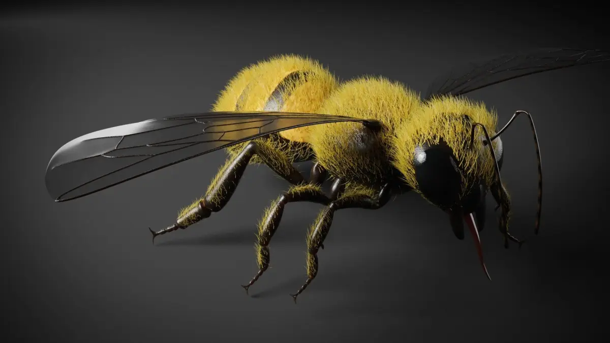 The whole hair system is defined by the particle systems, the density of the particles is defined by separated vertex weight groups painted on the model, so the hair appear only on the areas normally characteristic for the honey bee. The rendered hair are rendered as the objects and there are three separate types of hair objects which are used in the model. The hair objects are tapered at the end so the cross section is not constant.