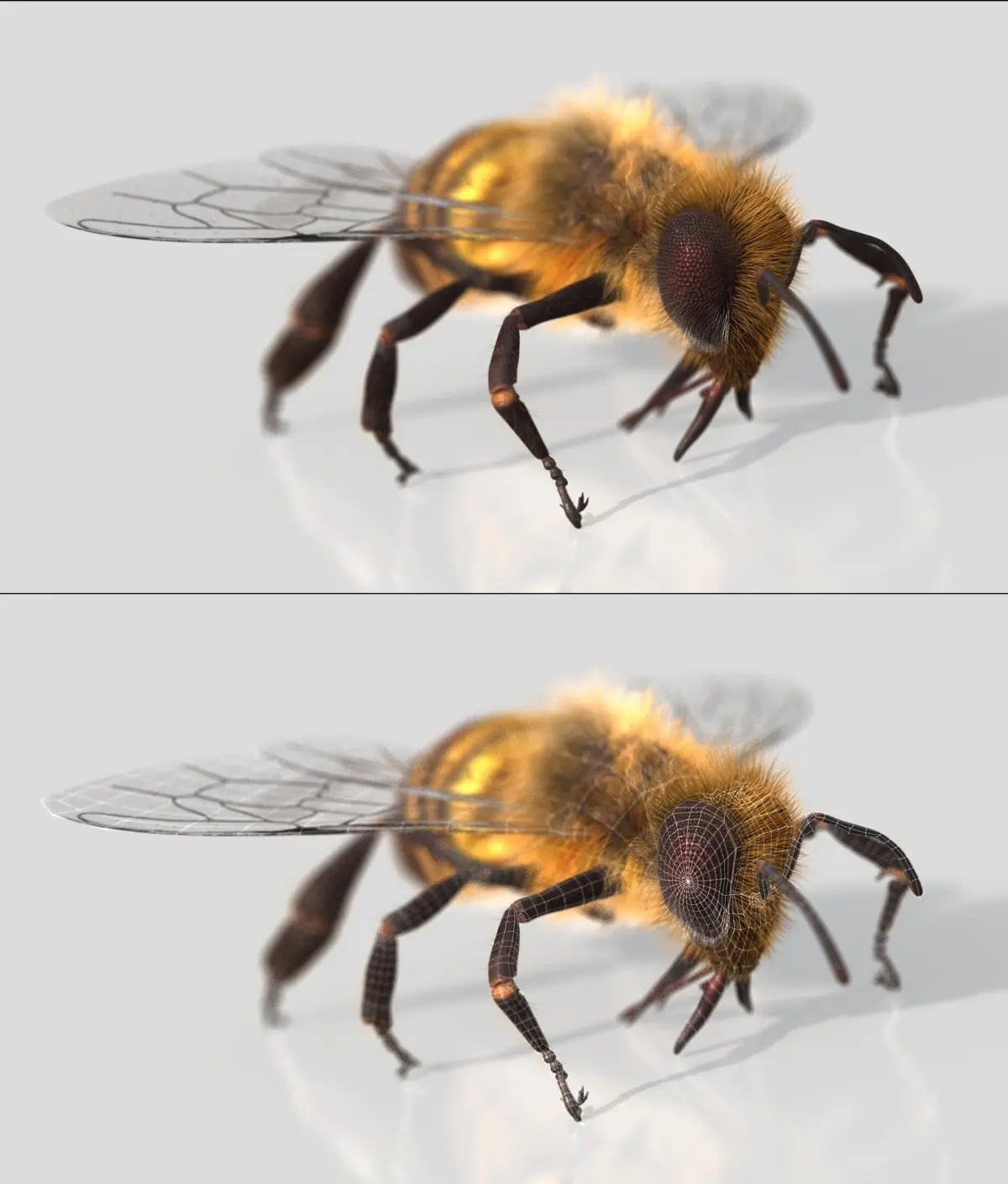 High Detailed Photorealistic Honeybee; FULLY RIGGED and ANIMATED, UVunwrapped and smoothable, made with Maya and xgen-core for hair.