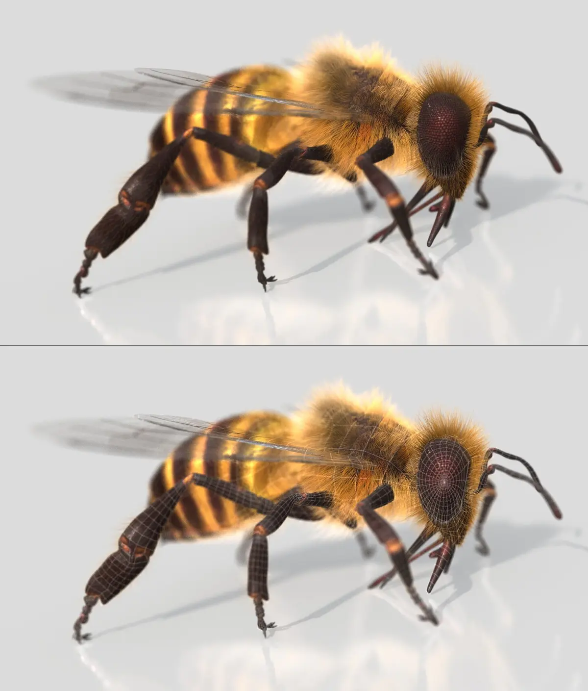 High Detailed Photorealistic Honeybee; FULLY RIGGED, UVunwrapped and smoothable, made with Maya and xgen-core for hair.