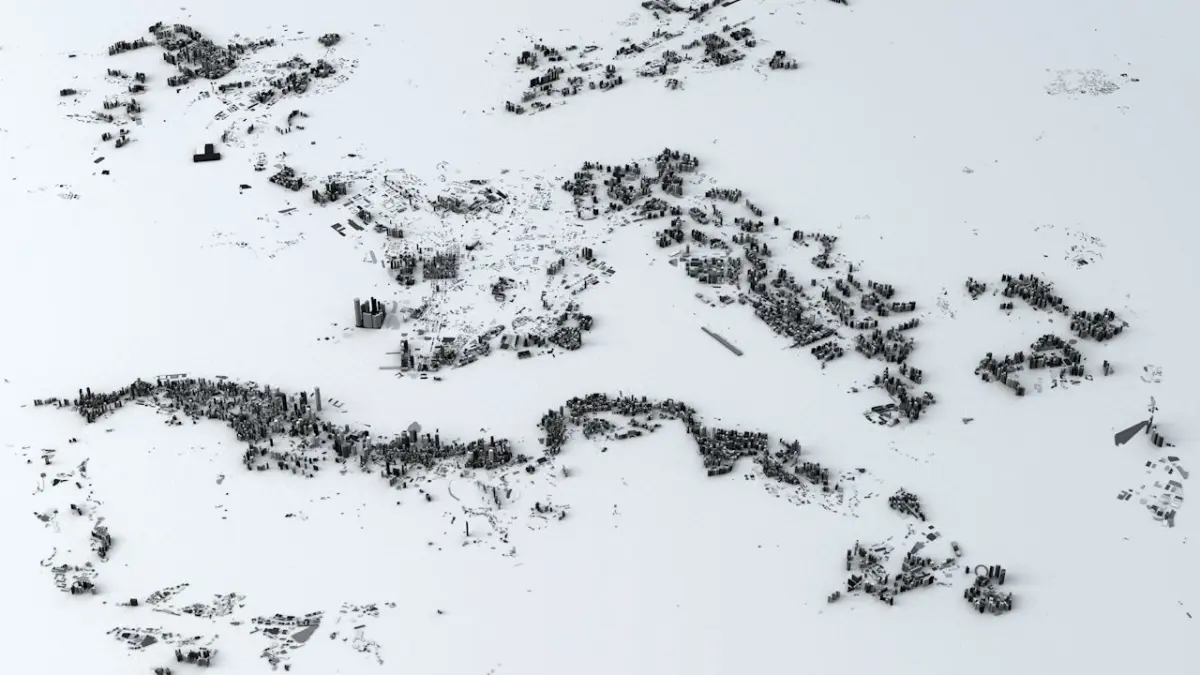 - the model is positioned on a flat surface (all buildings are on the “floor” - no elevation data included)