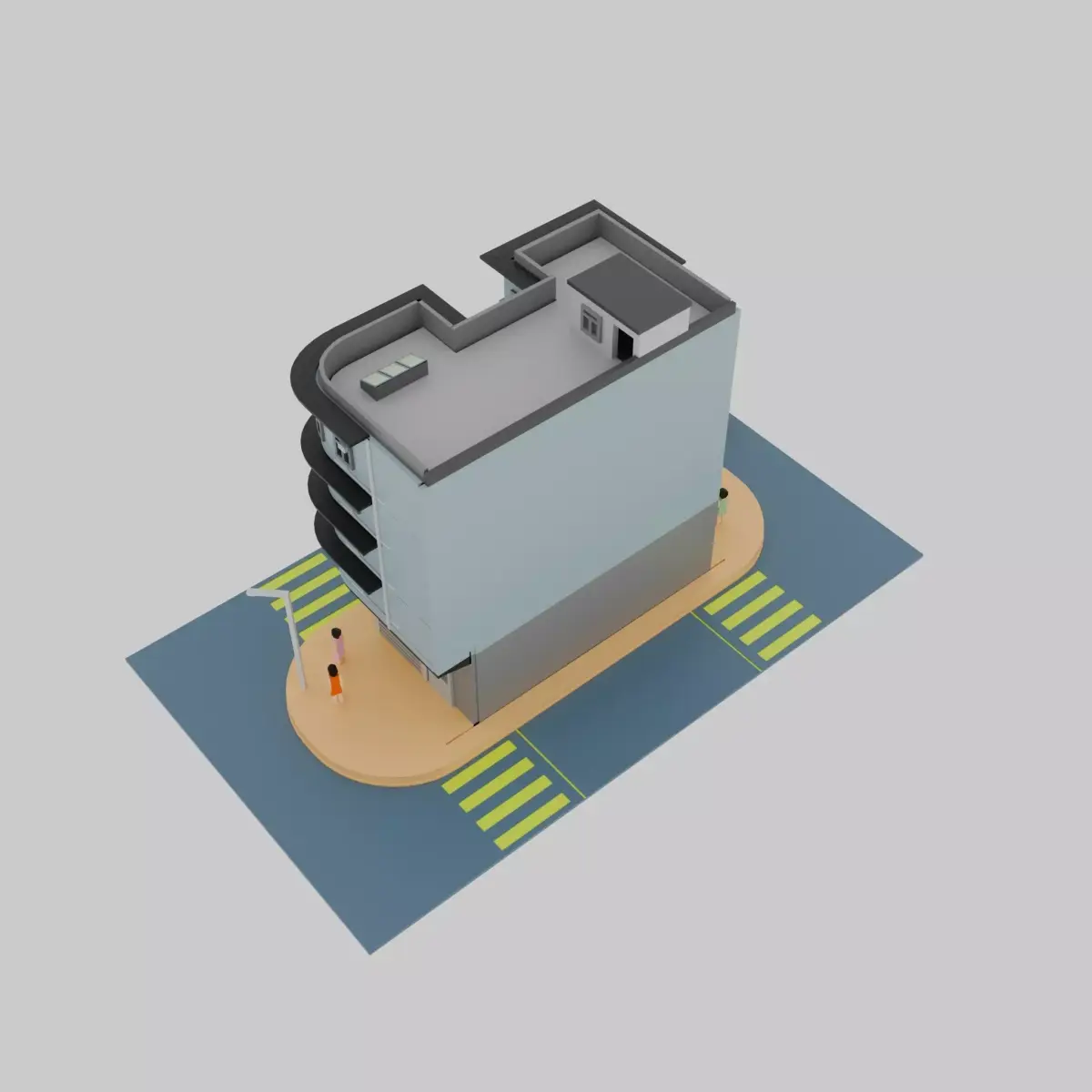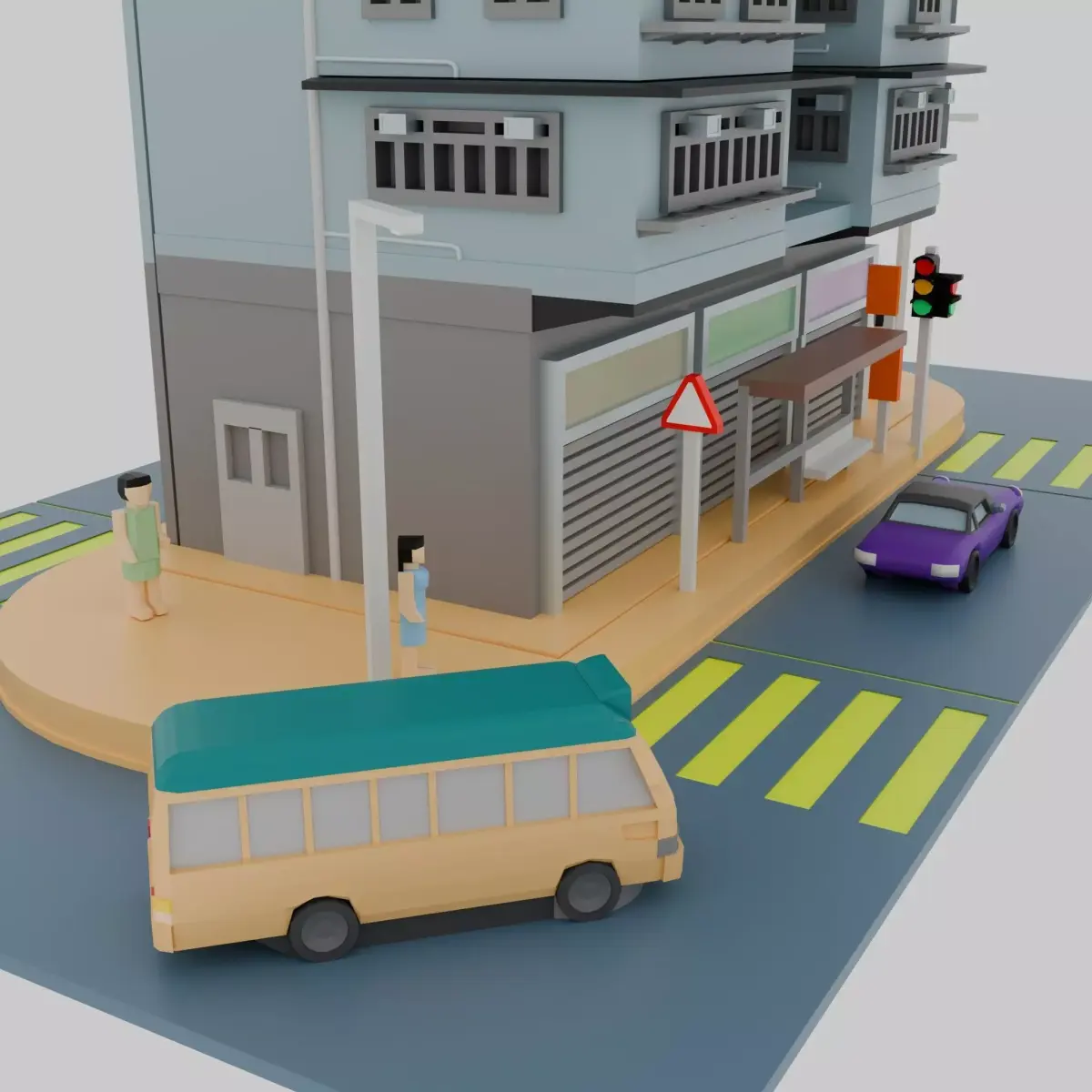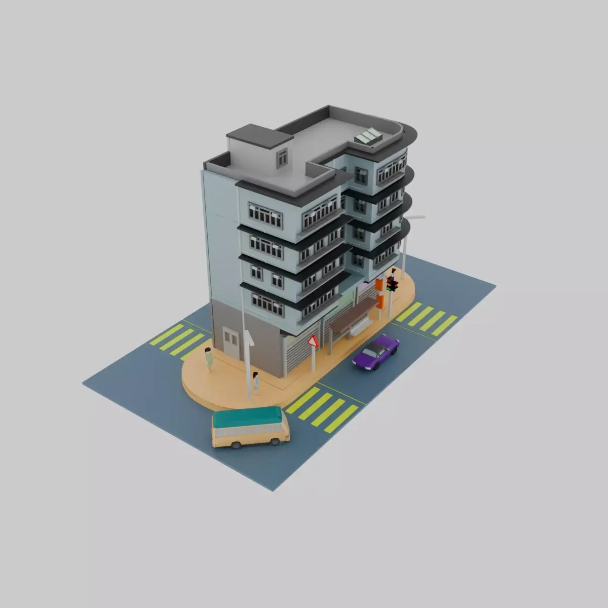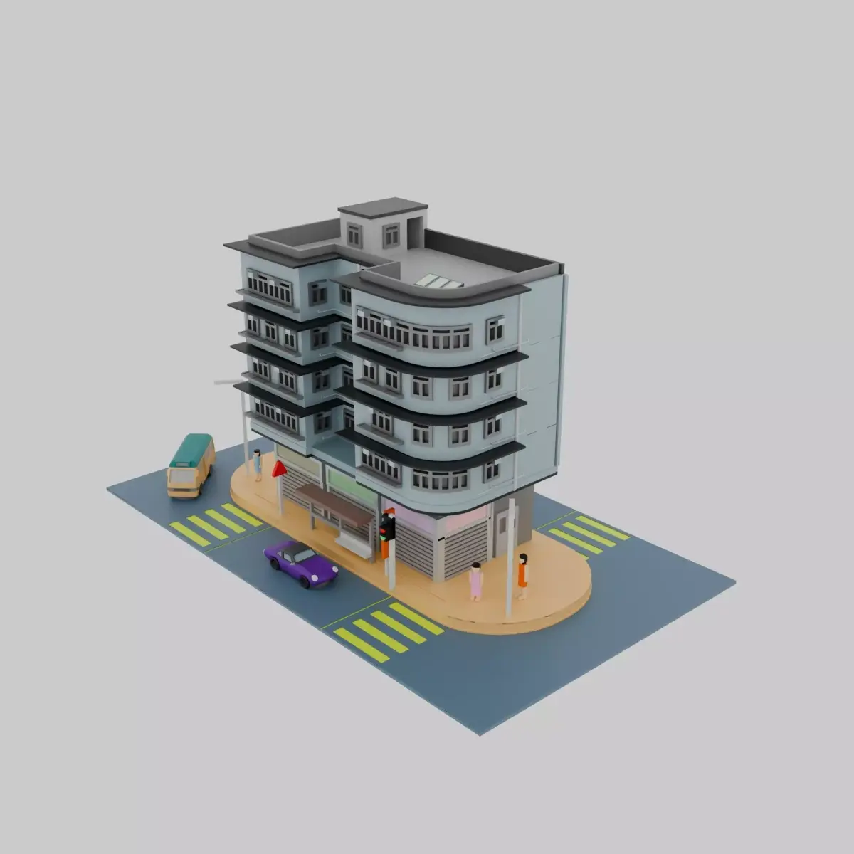 The model features a 4/F residential building, along with various types of bus stops, traffic lights, and pedestrians. You can purchase my motor pack (short Version), car pack, and signage pack separately at my website: businessyuen.com. This model is with high details.