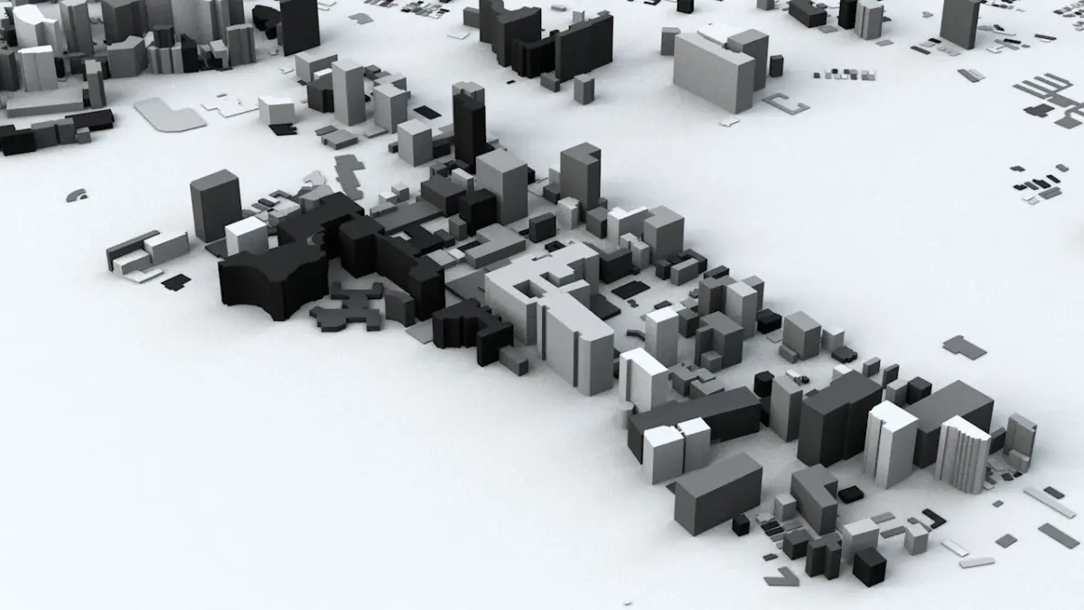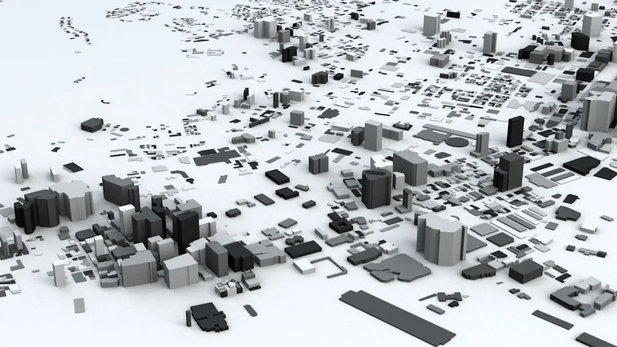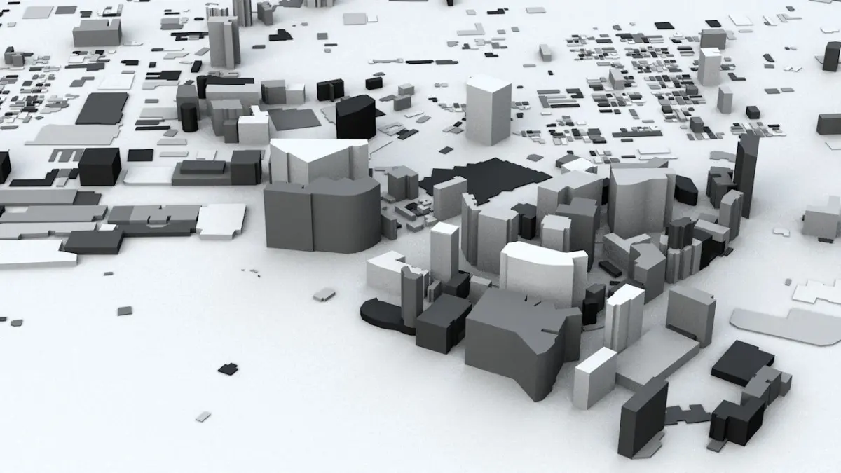 - the model is positioned on a flat surface (all buildings are on the “floor” - no elevation data included)