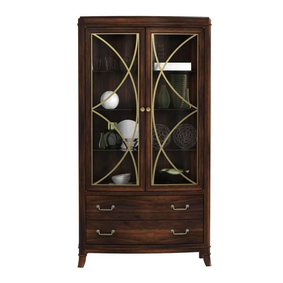 Hooker Furniture Dining Room Palisade Display ChinaIf you modern style but still revere traditional design, and if you seek a contemporary flair but appreciate classic beauty, then the Palisade collection offers you the best of both worlds.DIMENSIONSWidth: 44Depth: 18 1/4Height: 82"Weight: 224 lbVolume: 48.98 cu ftFeatures: Pair of wood-framed glass doors with metal fretworkThree adjustable glass shelves with plate groovesTwo drawersMaterial: Walnut Veneers with GlassFinish: Dark WoodStyle: TransitionalCollection: PalisadeNumber of Shelves: 3Number of Drawers: 2