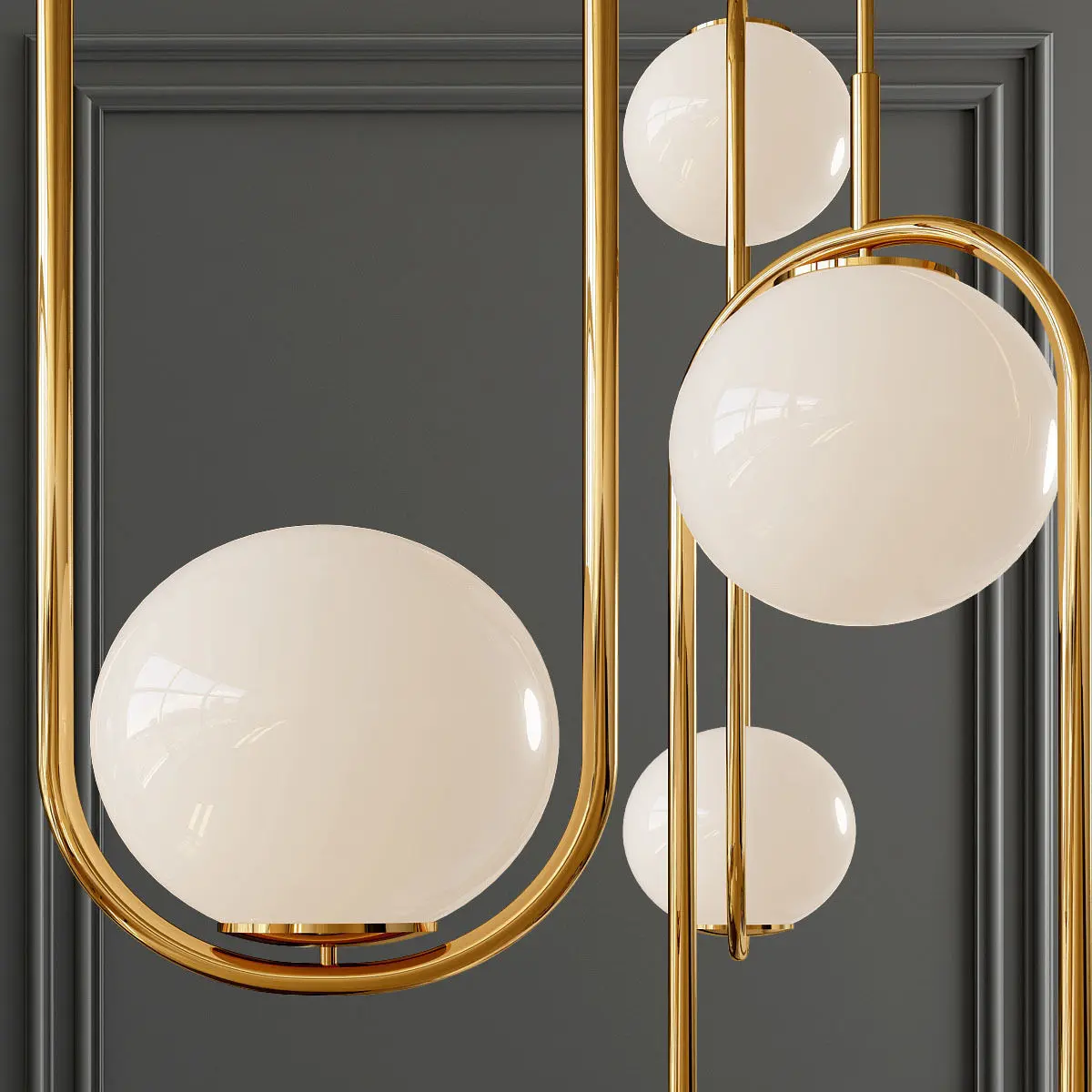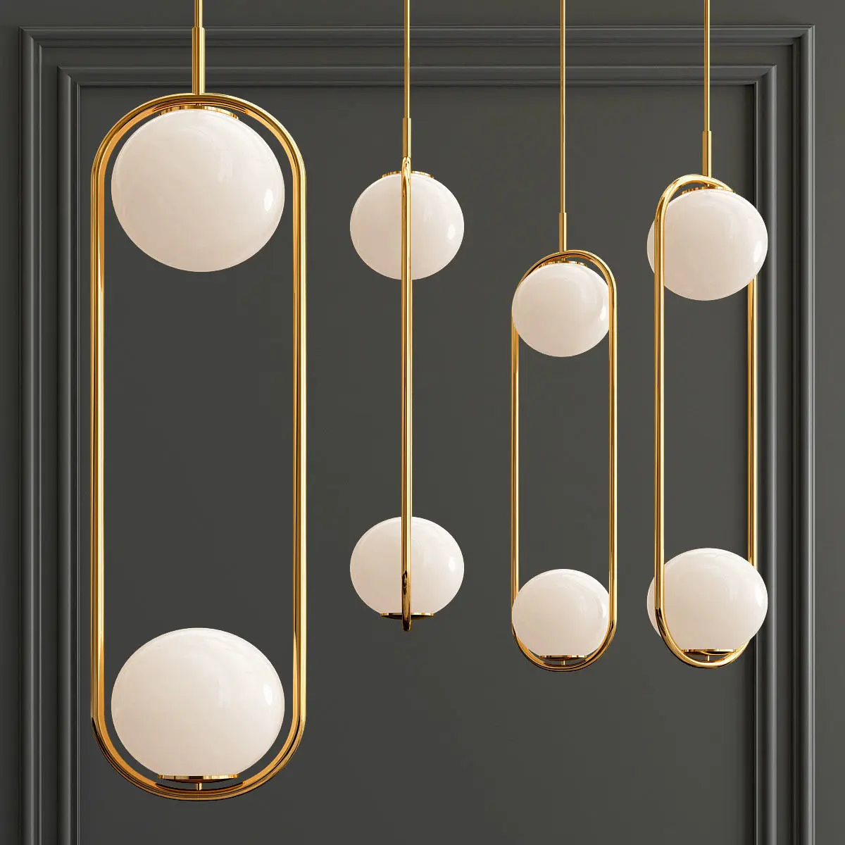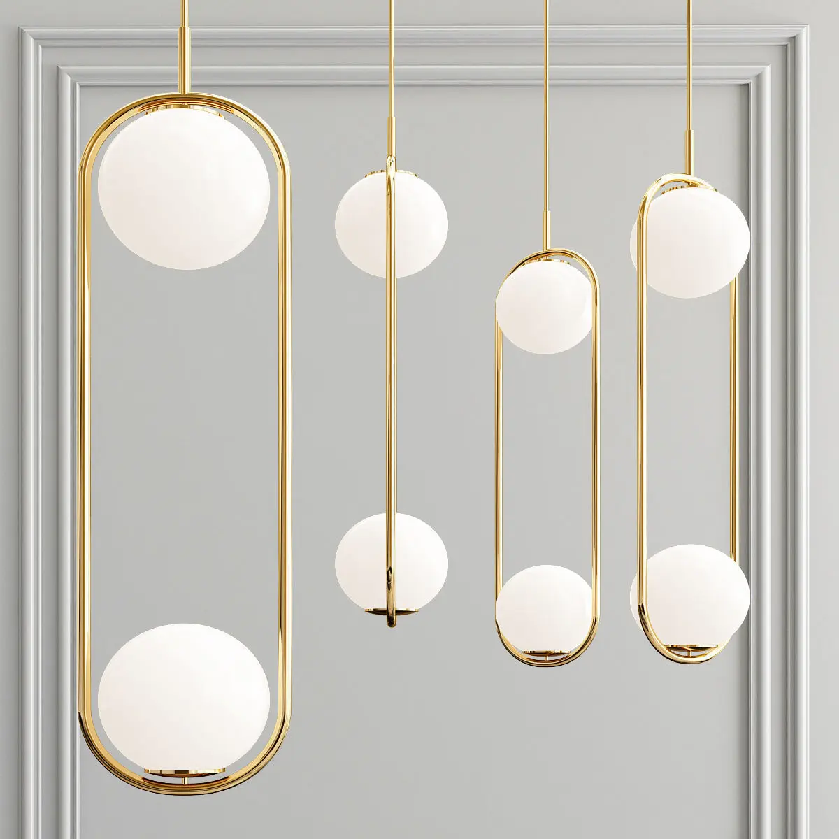 Подвесной светильник с двумя круглыми плафонами внутри на кольцевого каркасаМатериал Металл, СтеклоЦвета ЗолотоРазмеры Ø 18,5 × 67 см