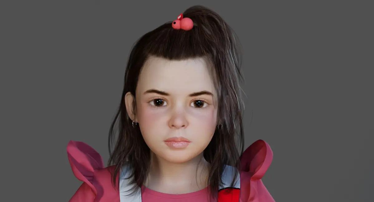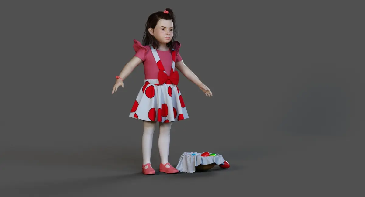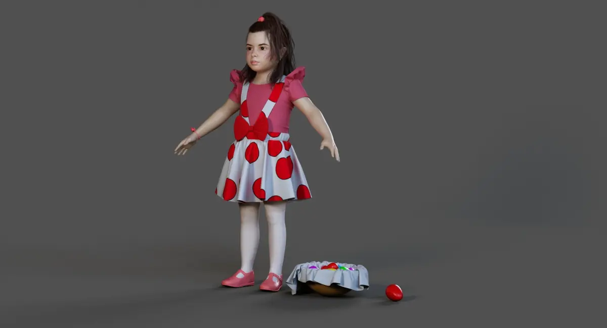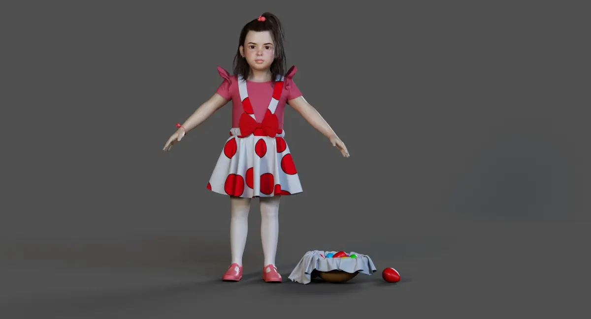 Introduce Hope, a highly detailed and realistic 3D model of a little girl dressed in a festive Easter outfit, complete with a basket of colorful eggs. Designed for production-quality use in games, cinematics, commercials, and educational content.
