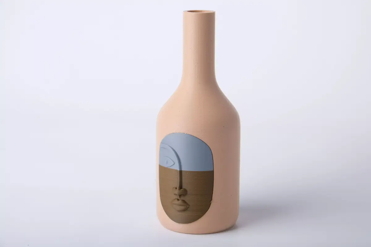 This tall bottle vase feels like a quiet little gallery piece—warm, minimal, and just slightly surreal. A smooth matte sand-colored silhouette rises into a long elegant neck, while the front “portrait” panel adds a calm face in two tones: an earthy lower half and a cool sky-blue horizon that slices across the forehead like morning light. The details are subtle but intentional—soft lips, a clean nose line, a single eye shape—so it reads as modern art from across the room and becomes more expressive the closer you get. Made from matte 3D-printed plastic, it’s crisp, lightweight, and display-ready on a shelf, console, or dining table—beautiful with one stem, dried grasses, or simply standing as a sculptural object.
