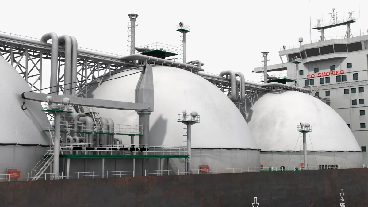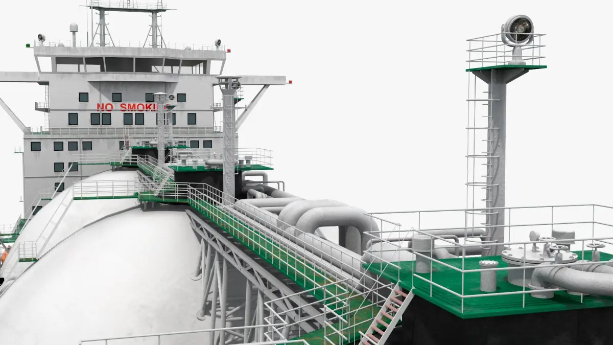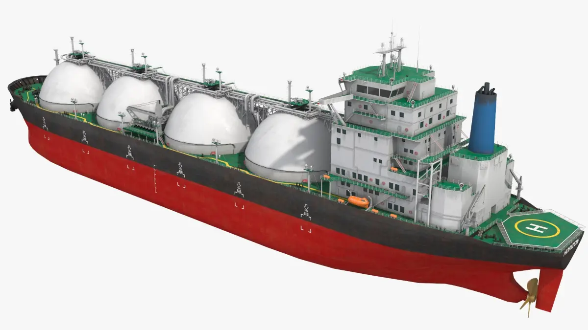 This model showcases the vessel's distinctive spherical storage tanks and robust hull design, engineered to ensure safe and efficient transport of LNG across vast oceanic distances. The tanker is equipped with advanced navigation systems, safety features, and a propulsion system optimized for long voyages.