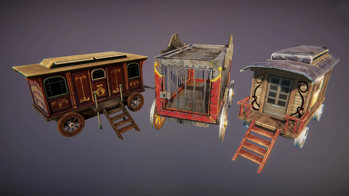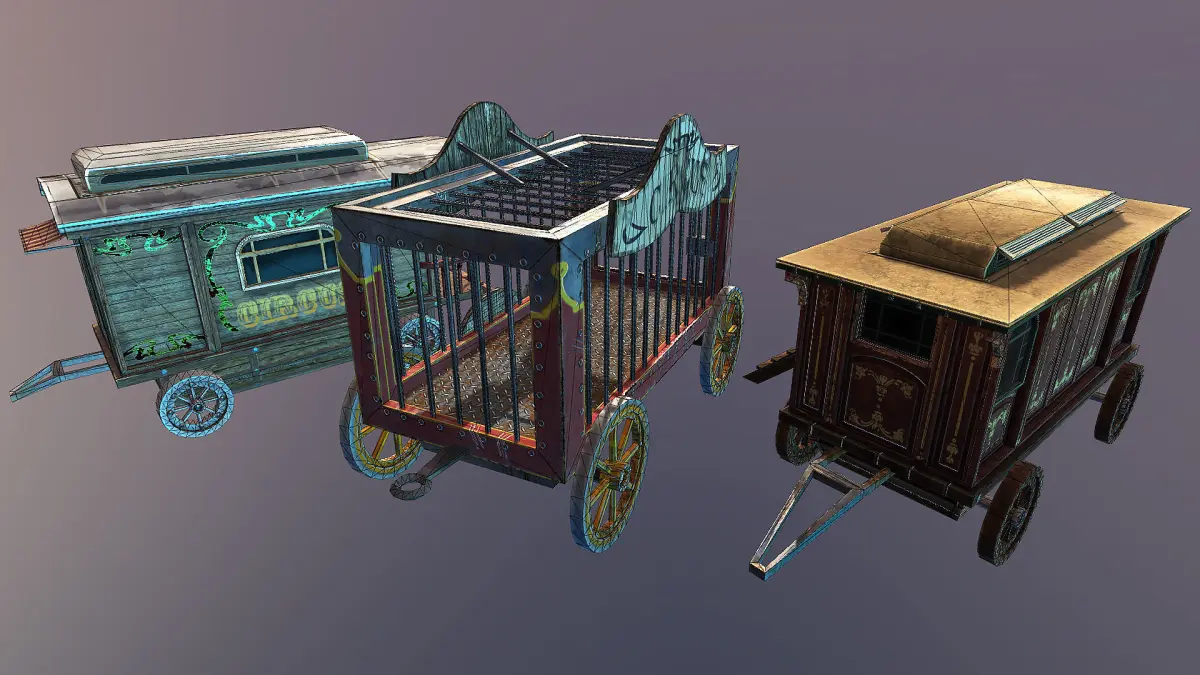 Three low-poly circus vagons for any your project.9 textures, 3 PBR materials, 3 meshes. Polycount around 1000 for each.