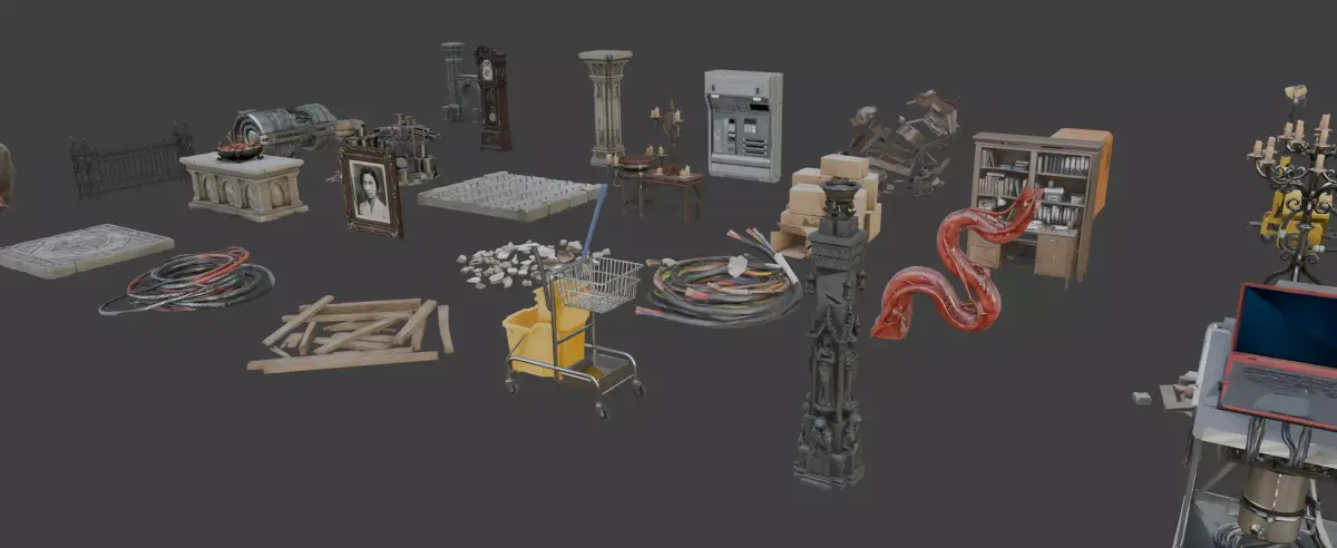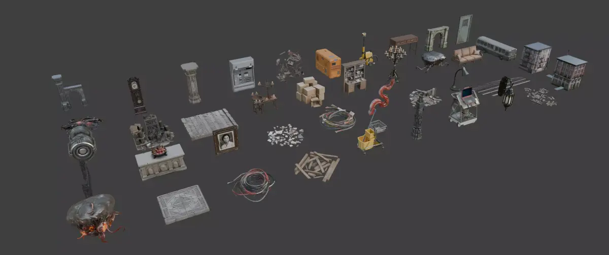 A versatile horror environment prop pack designed for building ruined locations, haunted interiors, abandoned facilities, and cinematic horror scenes. This set contains a wide variety of objects ranging from architectural ruins and gothic props to technical equipment and environmental clutter.