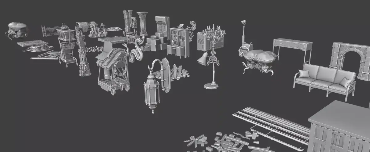 The pack includes elements such as columns, arches, furniture, lighting fixtures, boxes, cables, industrial props, decorative objects, debris, and even small building structures that can help populate larger environments.