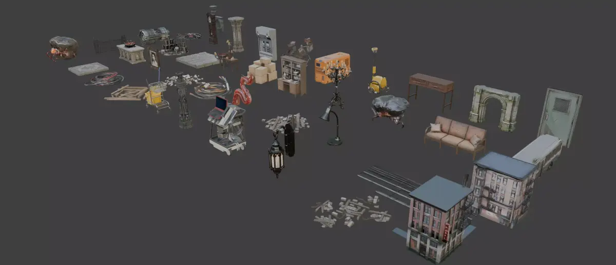 Gothic and ruined architectural elements (arches, columns, structures) Horror scene props and furniture (tables, couches, decorations) Industrial and technical objects (equipment, cables, devices) Environmental clutter and debris for scene dressing Stylized low poly assets optimized for games