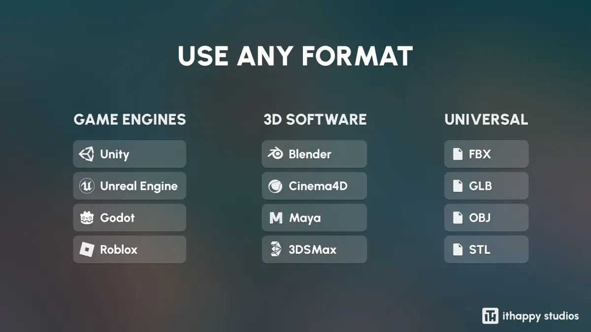 FILESYou’ll be able to download formats such as Unity Package, UE, Blender, C4D, Maya, 3DSMax, FBX, OBJ, GLTF, and STL.