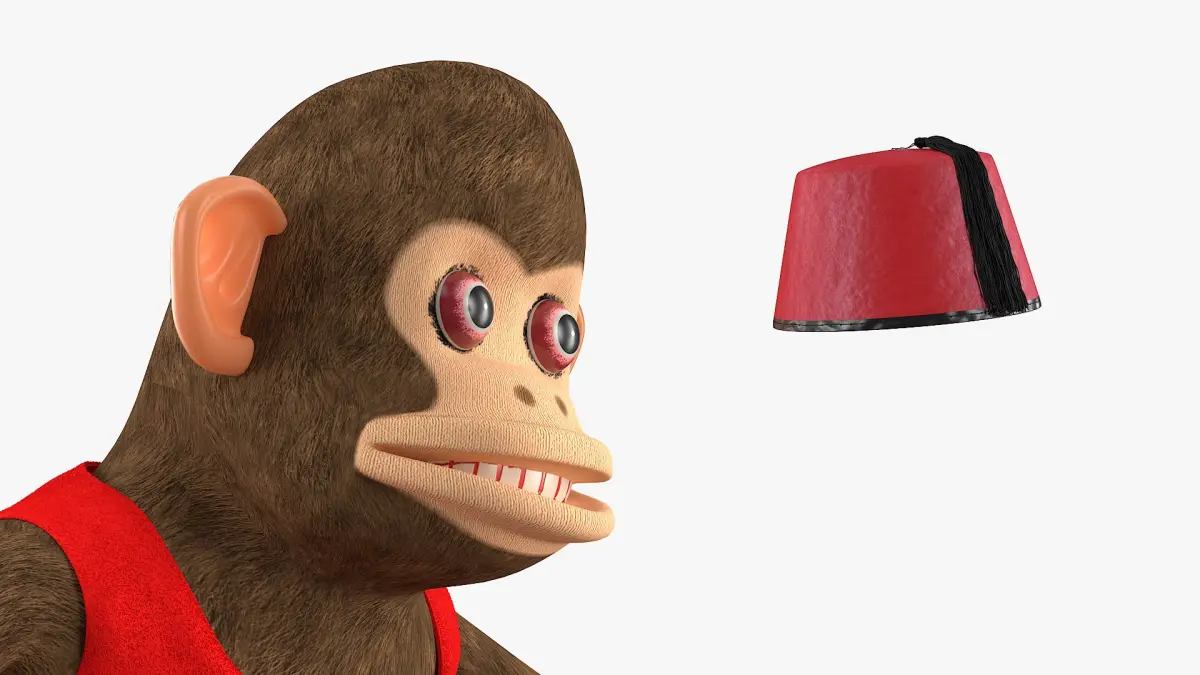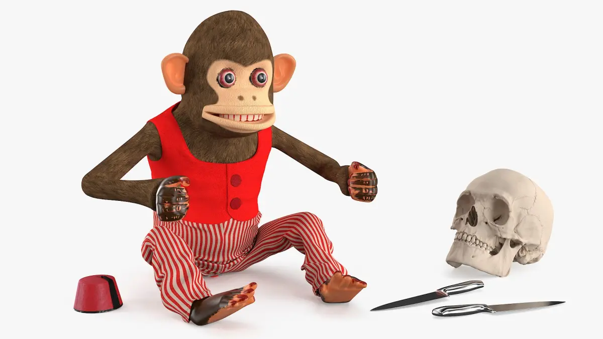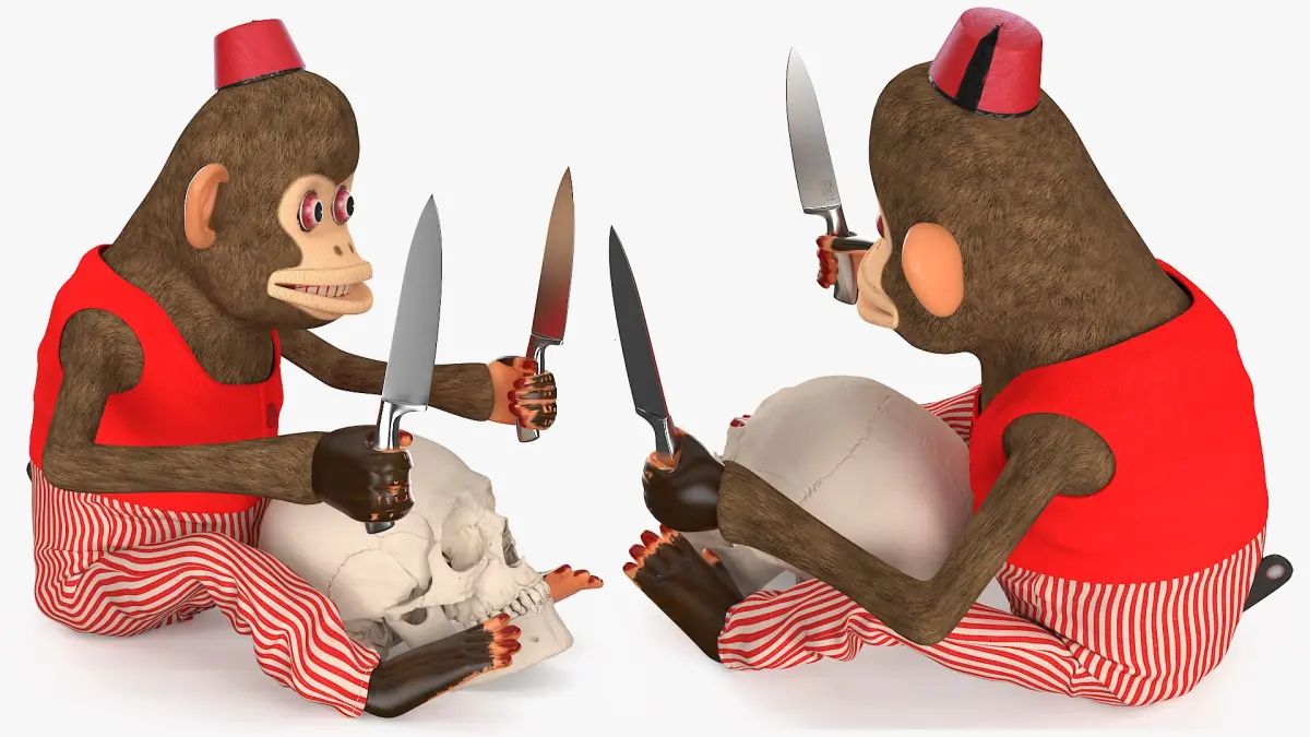 Horror Monkey Figurine with Blades Seated Pose and Skull is a three-dimensional model of vintage monkey scary windup doll which is a horror monkey figurine with knives and a human skull.