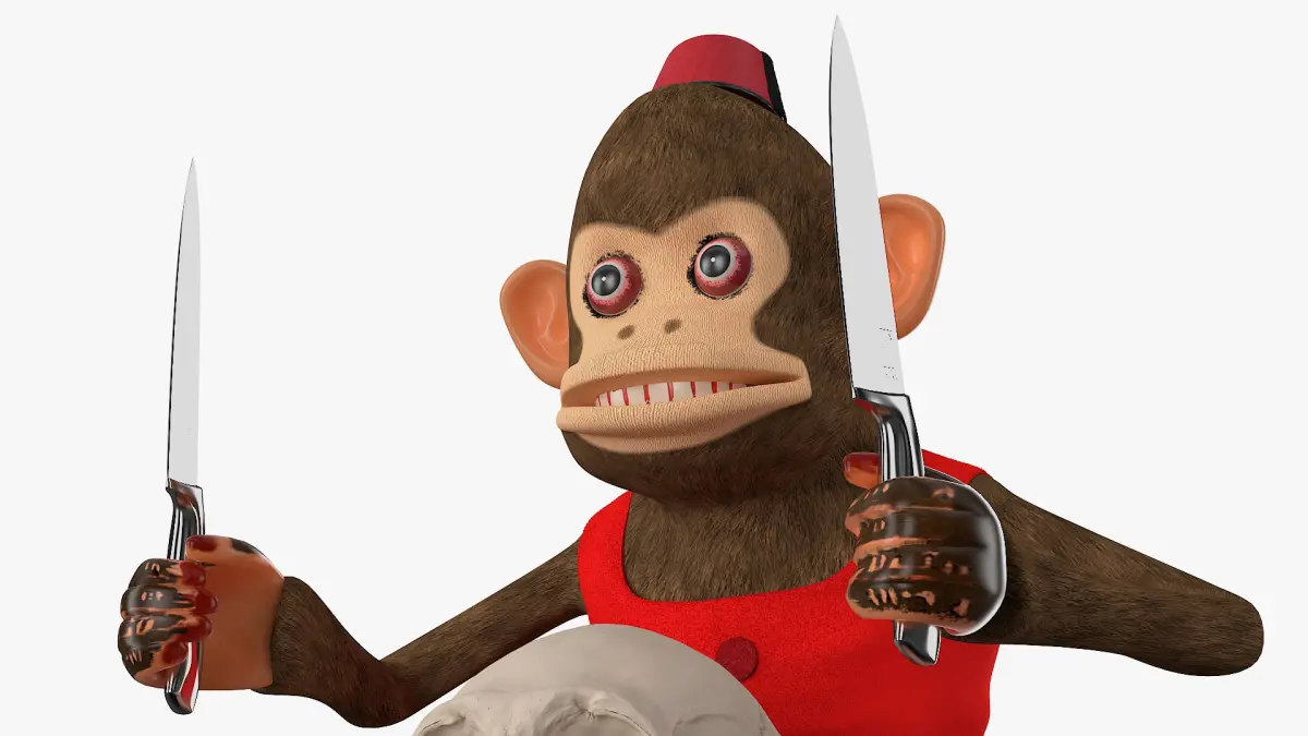 The vintage monkey scary windup doll with knives is a horror monkey figurine with blades and a human skull. It features a menacing design and movable arms, evoking a classic horror aesthetic. For collectors, it represents a striking piece of macabre memorabilia.