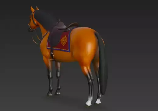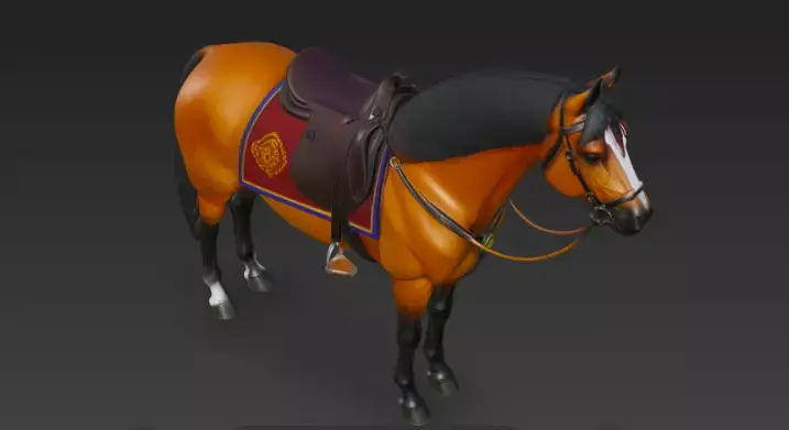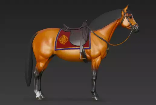 A highly realistic horse 3d model, standing alert and proud in a classic pose. The horse has a glossy chestnut coat with subtle black mane and tail, strong muscular build, expressive dark eyes, and traditional Ghorkha saddle markings. Rendered in ultra-realistic style with fine fur textures, soft natural lighting, and sharp focus on the horse's features.