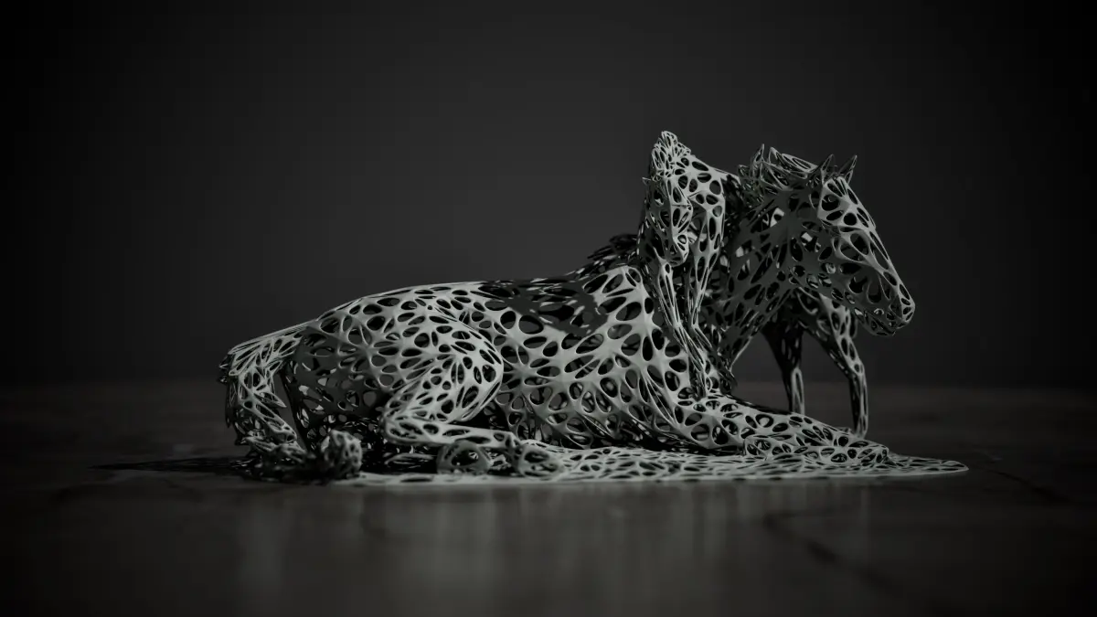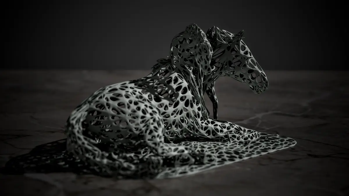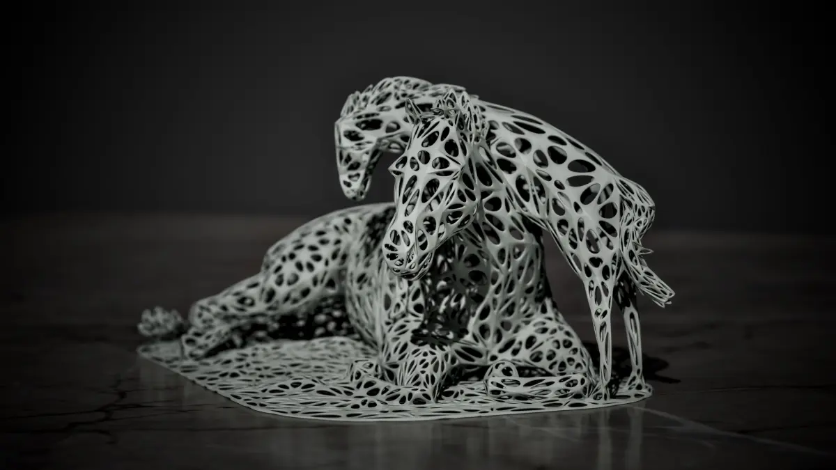 A printable model for sla printer of a sculpture of a mother horse and her calf inspired by a real photo.
