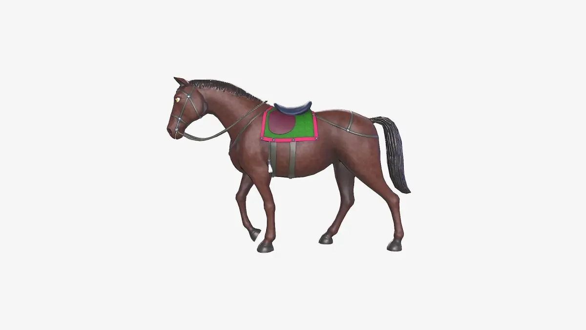 Horse saddled, low poly game-ready 3D-character. Rigged (CAT rig).Total polys: 5207; total tris: 9292; total verts: 4935.PBR-textures: 4096x4096, Albedo Map, Normal Map, Occlusion Map, Metalness Map, Roughness Map, ID Map.There are 4 separate animations: idle (120 frames), walk (32 frames), trot (15 frames), gallop (16 frames).In the FBX archive four separate FBX files - Idle, Walk, Trot and Gallop. In the MAX archive five separate MAX files - Base, Idle, Walk, Trot and Gallop.