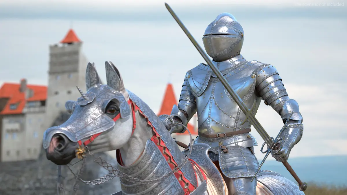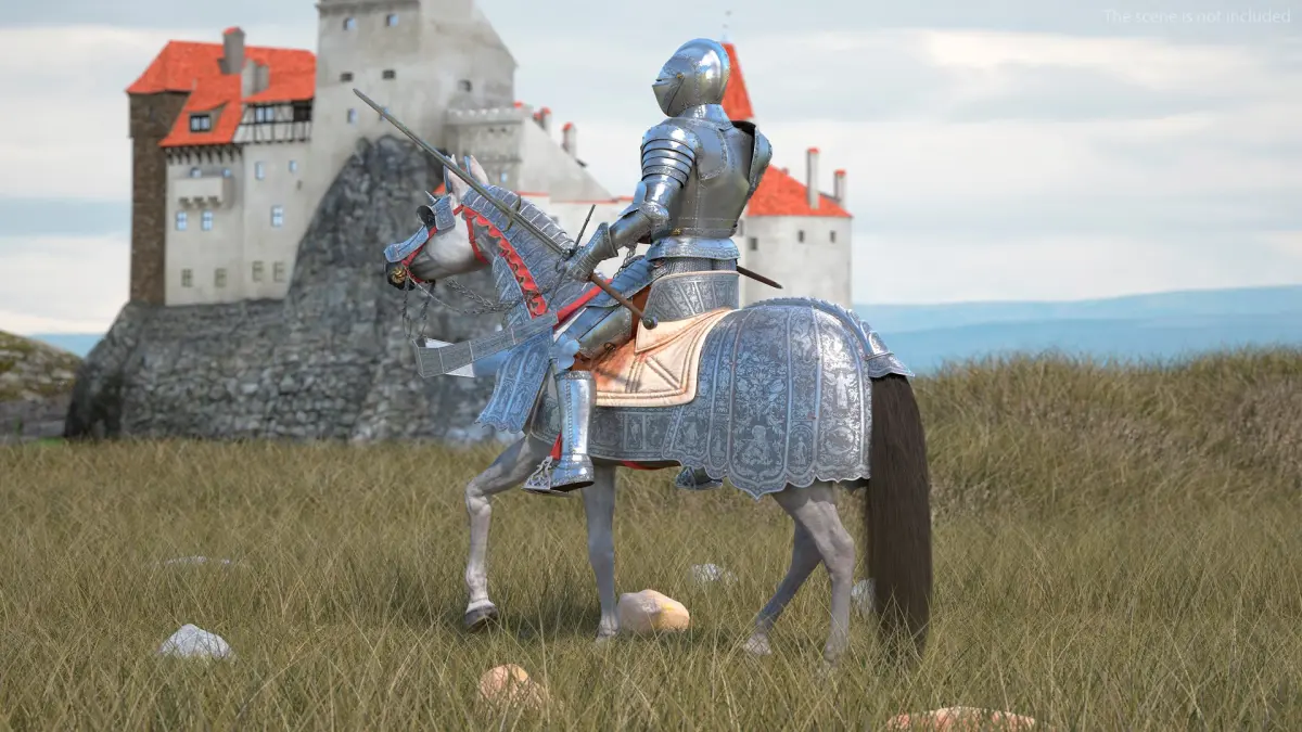 Horse in Medieval Armor with Knight Rider Fur is a three-dimensional model of knight holding a sword and riding a fully armored horse, that is designed to capture the detailed appearance of medieval warfare mounts and their riders.