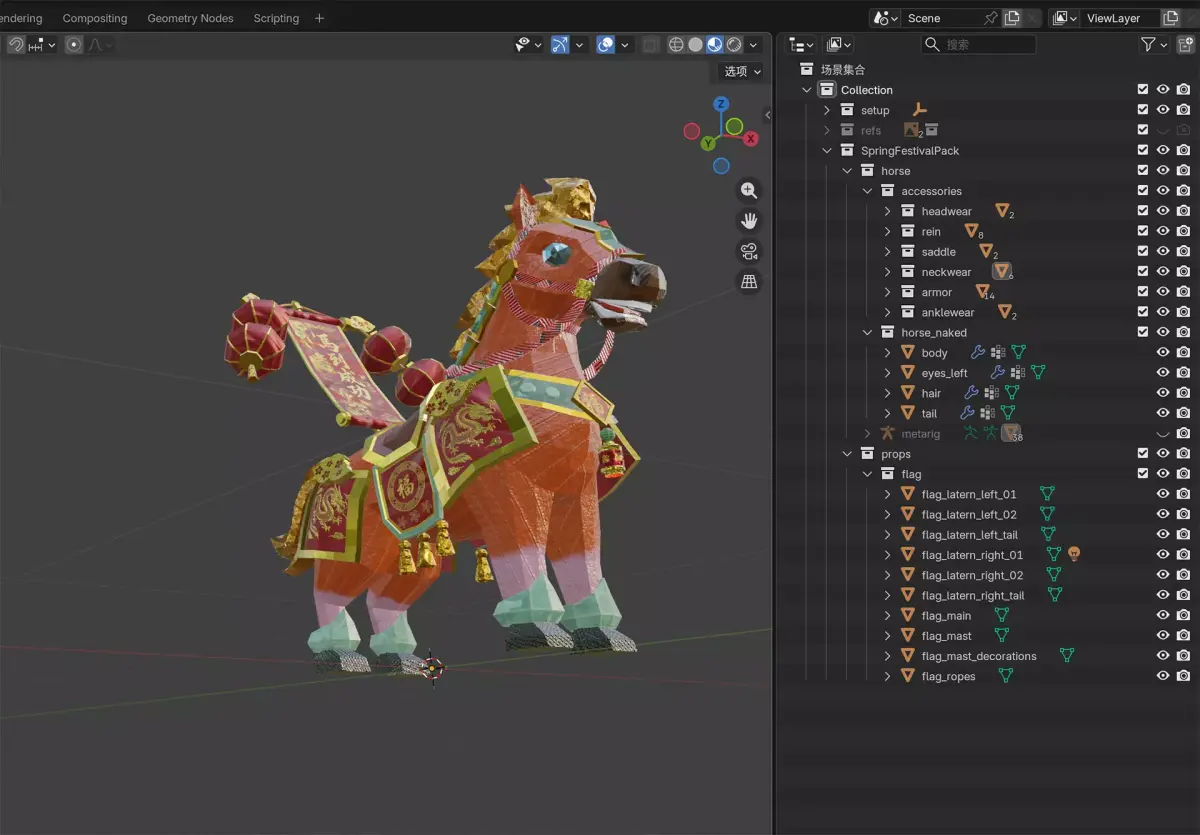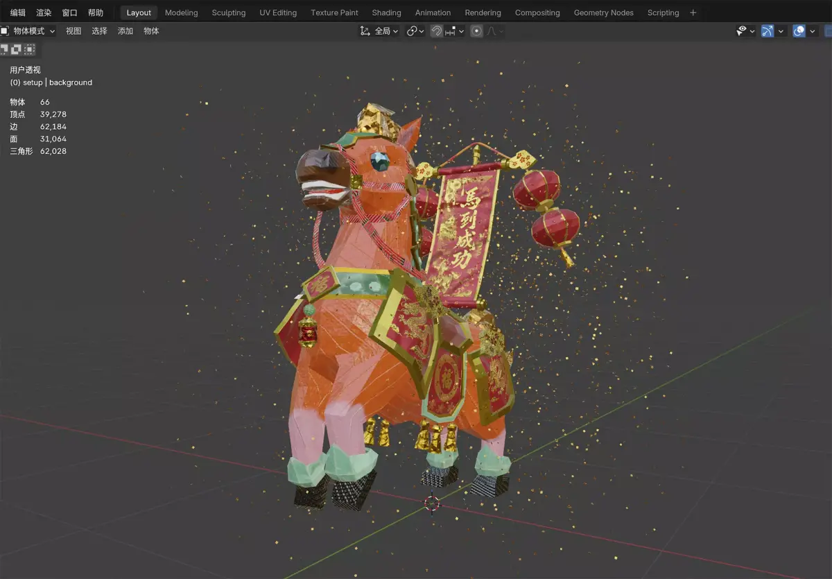 Every sharp angle and low-poly facet has been meticulously crafted to create a sense of geometric sculpture. The interplay of light and shadow on its surface mimics the texture of folded paper. With its hanging lanterns and flowing ribbons, this model brings a rich, festive energy to any creative space.