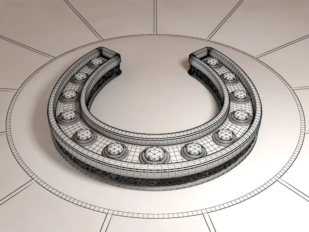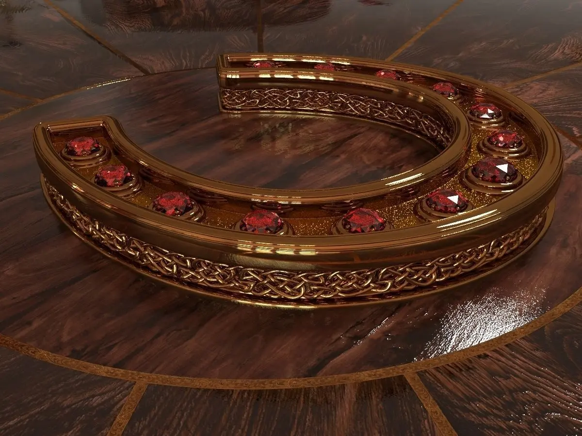 Detailed hi-poly golden horseshoe with ruby on wooden table. Rendered with V-ray 3.00.07. Camera and hdri-map included.