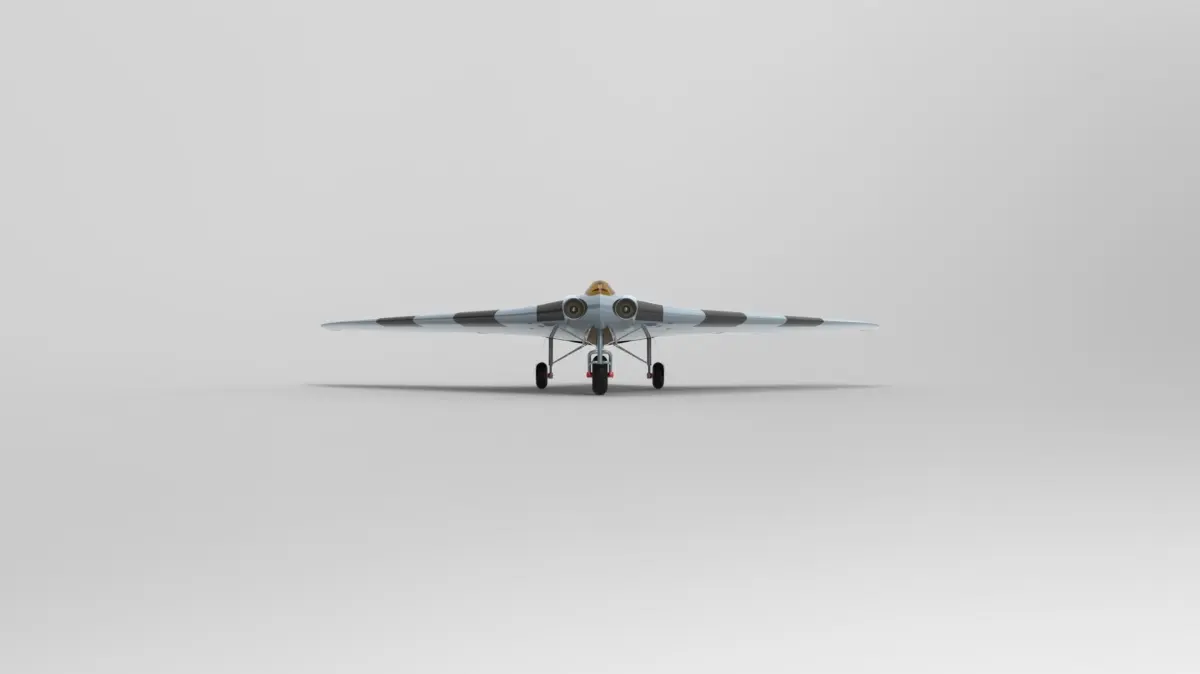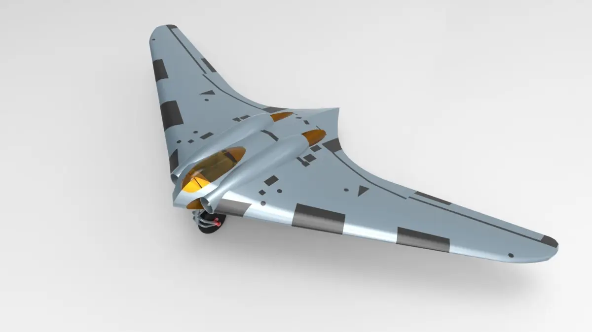 The H.IX was of mixed construction, with the center pod made from welded steel tubing and wing spars built from wood. The wings were made from two thin, plywood panels glued together with a charcoal and sawdust mixture. The wing had a single main spar, penetrated by the jet engine inlets, and a secondary spar used for attaching the elevons. It was designed with a 7g load factor and a 1.8× safety rating; therefore, the aircraft had a 12.6g ultimate load rating. The wing's chord/thickness ratio ranged from 15% at the root to 8% at the wingtips.[1] The aircraft utilized retractable tricycle landing gear, with the nosegear on the first two prototypes sourced from a He 177's tailwheel system, with the third prototype using an He 177A main gear wheelrim and tire on its custom-designed nosegear strutwork and wheel fork. A drogue parachute slowed the aircraft upon landing. The pilot sat on a primitive ejection seat. A special pressure suit was developed by Dräger. The aircraft was originally designed for the BMW 003 jet engine, but that engine was not quite ready, and the Junkers Jumo 004 engine was substituted.[1]
