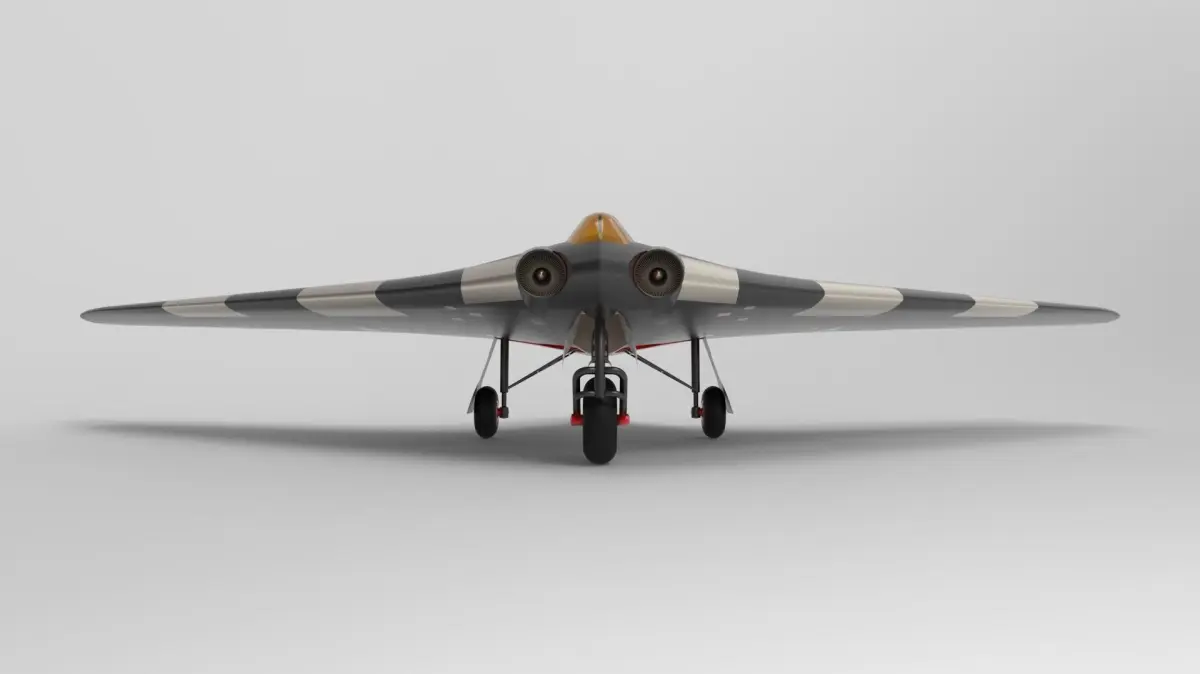 The design was a response to Hermann Göring's call for light bomber designs capable of meeting the 3×1000 requirement; namely, to carry 1,000 kilograms (2,200 lb) of bombs a distance of 1,000 kilometres (620 mi) with a speed of 1,000 kilometres per hour (620 mph). Only jets could provide the speed, but these were extremely fuel-hungry, so considerable effort had to be made to meet the range requirement. Based on a flying wing, the Ho 229 lacked all extraneous control surfaces to lower drag. It was the only design to come even close to the requirements, and received Göring's approval. Its ceiling was 15,000 metres (49,000 ft).In the early 1930s, the Horten brothers had become interested in the flying wing design as a method of improving the performance of gliders. The German government was funding glider clubs at the time because production of military and even motorized aircraft was forbidden by the Treaty of Versailles after World War I. The flying wing layout removed the need for a tail and associated control surfaces and theoretically offered the lowest possible weight, using wings that were relatively short and sturdy, and without the added drag of the fuselage. The result was the Horten H.IV.[3]