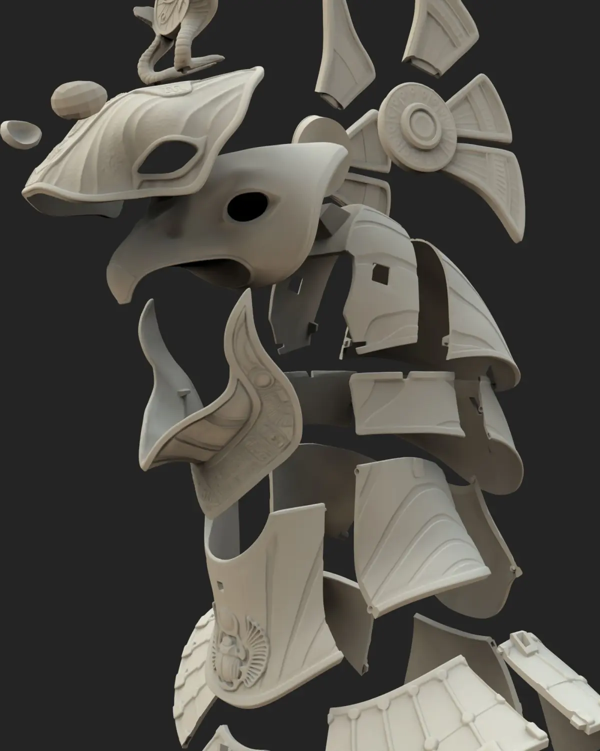Ornamental helmet concept made in Zbrush.V3 STL files with cuts and joints added. Avarage size.Higfh poly files as well FBX, OBJ, blender splited in parts for rendering.Cuts and joints ready.