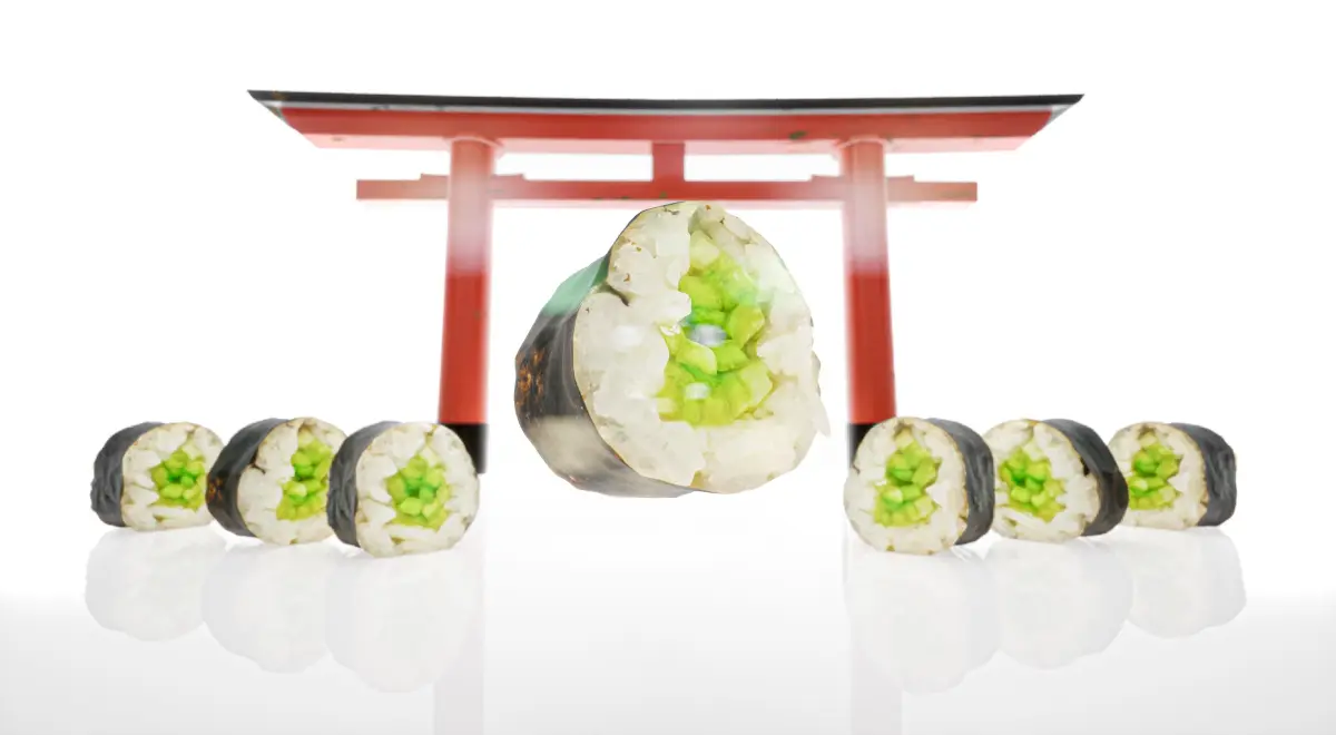A DETAILED 3D MODEL OF Sushi: Hosomaki kunsey, HOSOMAKI SALMON, Hosomaki avocado,Hosomaki tuna, Hosomaki cucumber.