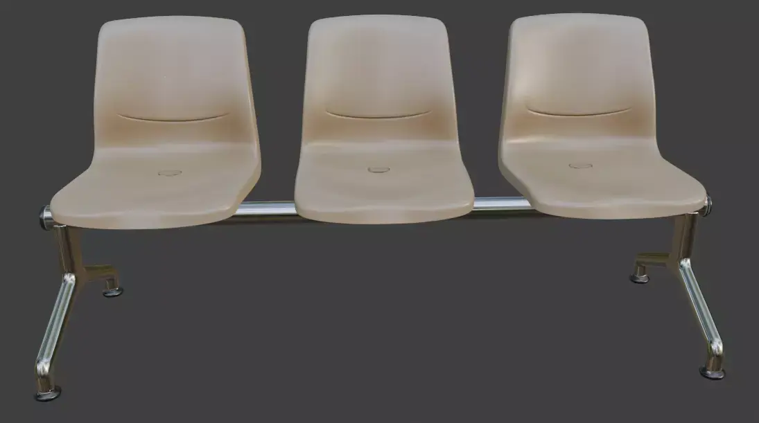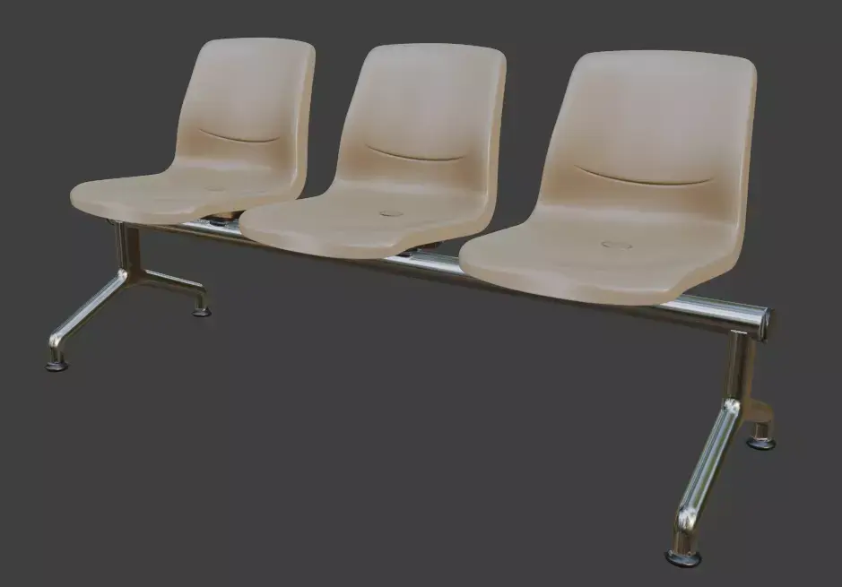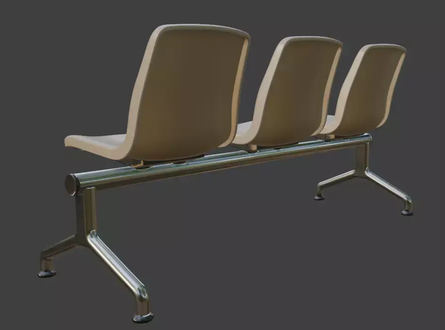 High-quality 3D model of a modern 3-seater airport waiting bench with sleek chrome metal frame and comfortable padded gray upholstery on seats and backrests. This beam-style public seating features sturdy angled legs, armrests, and realistic metallic reflections, ideal for airport terminals, hospital waiting rooms, train stations, office lobbies, clinics, and other public spaces.Perfect for architectural visualization, interior renders, game environments, VR/AR experiences, and urban scenes. The model is optimized with clean topology, UV unwrapped, and PBR materials for high realism while maintaining performance.Key Features: